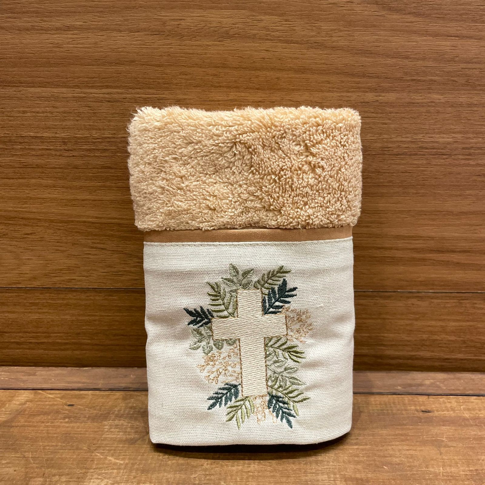 Conteúdo da Embalagem: 1 Toalha de lavabo cruz e ramos bege