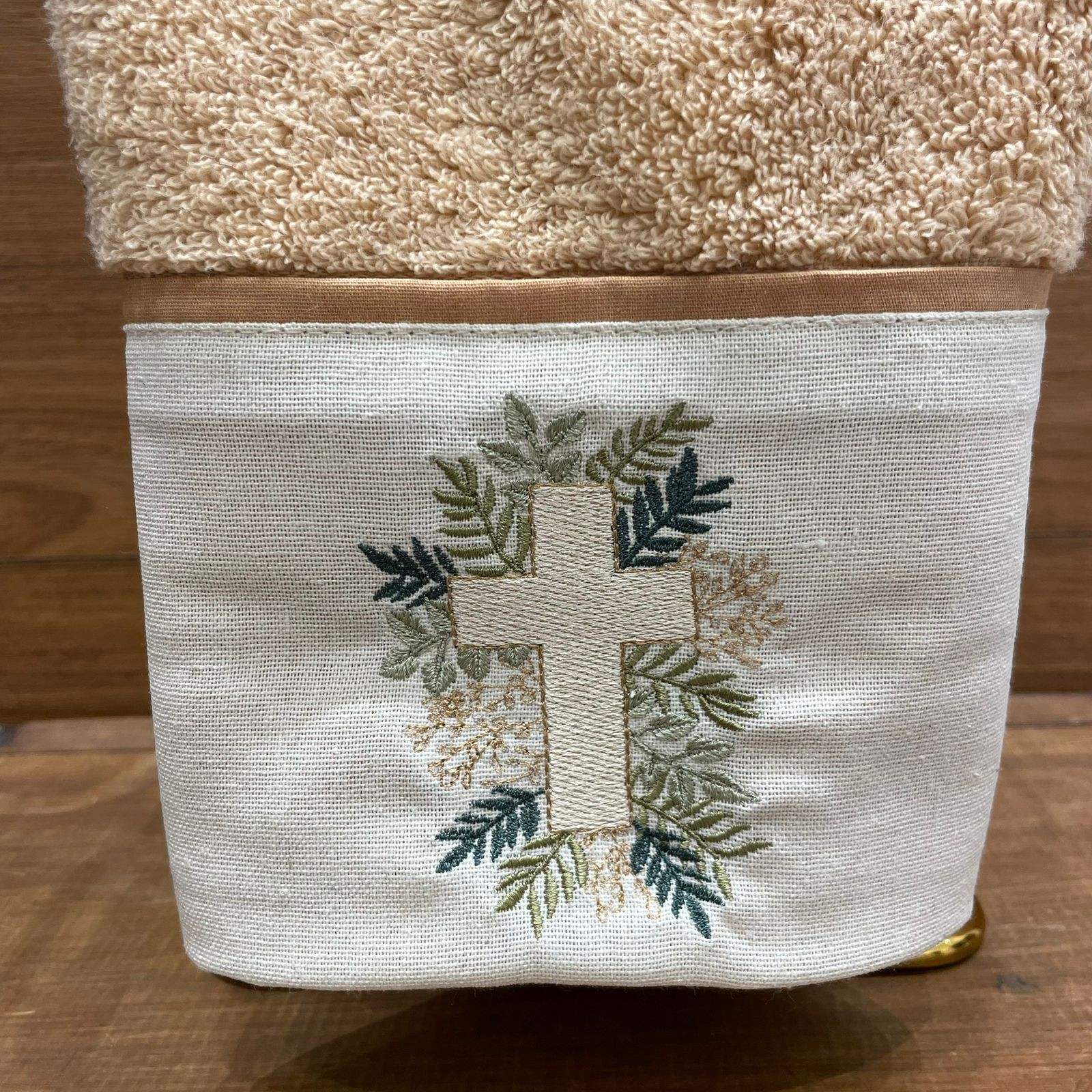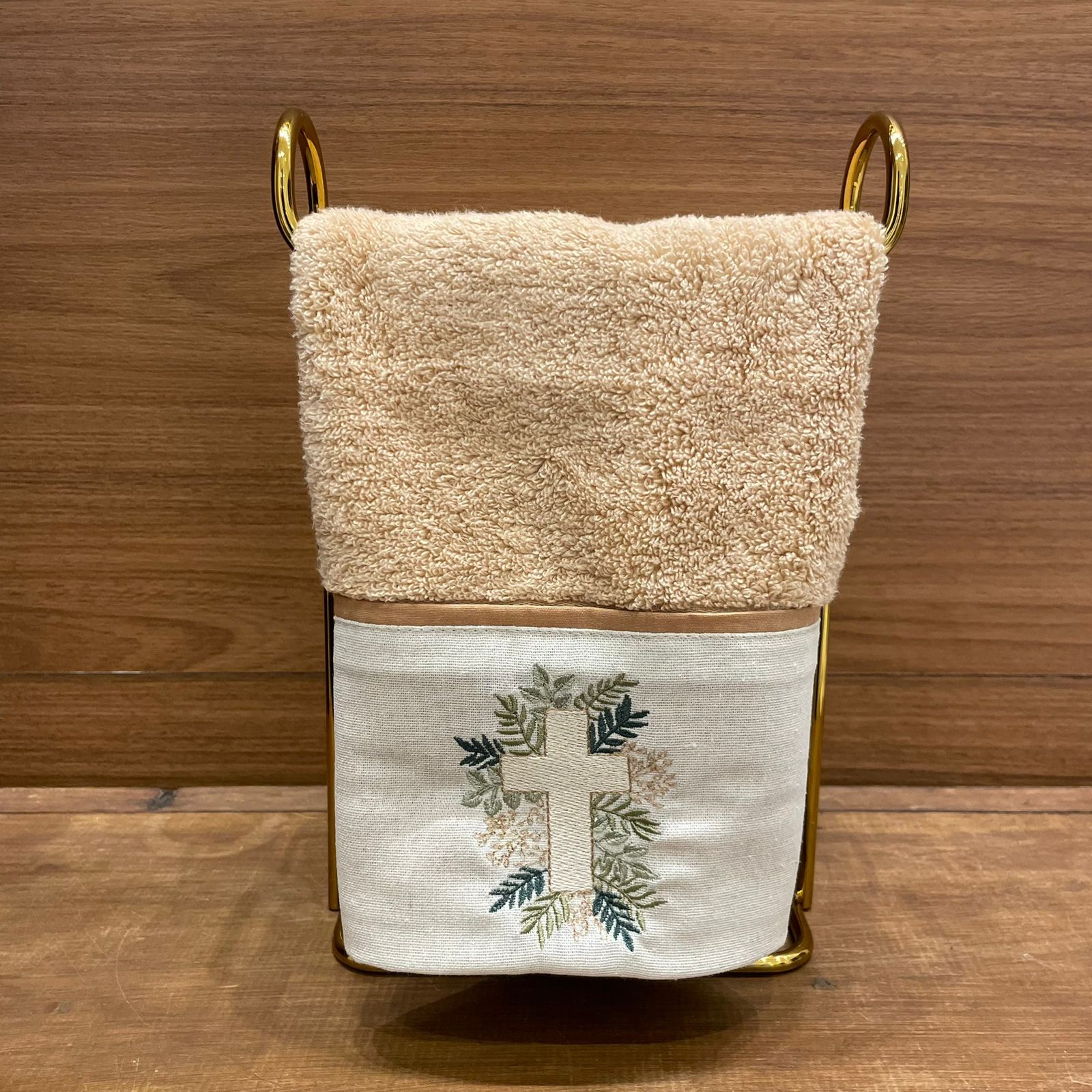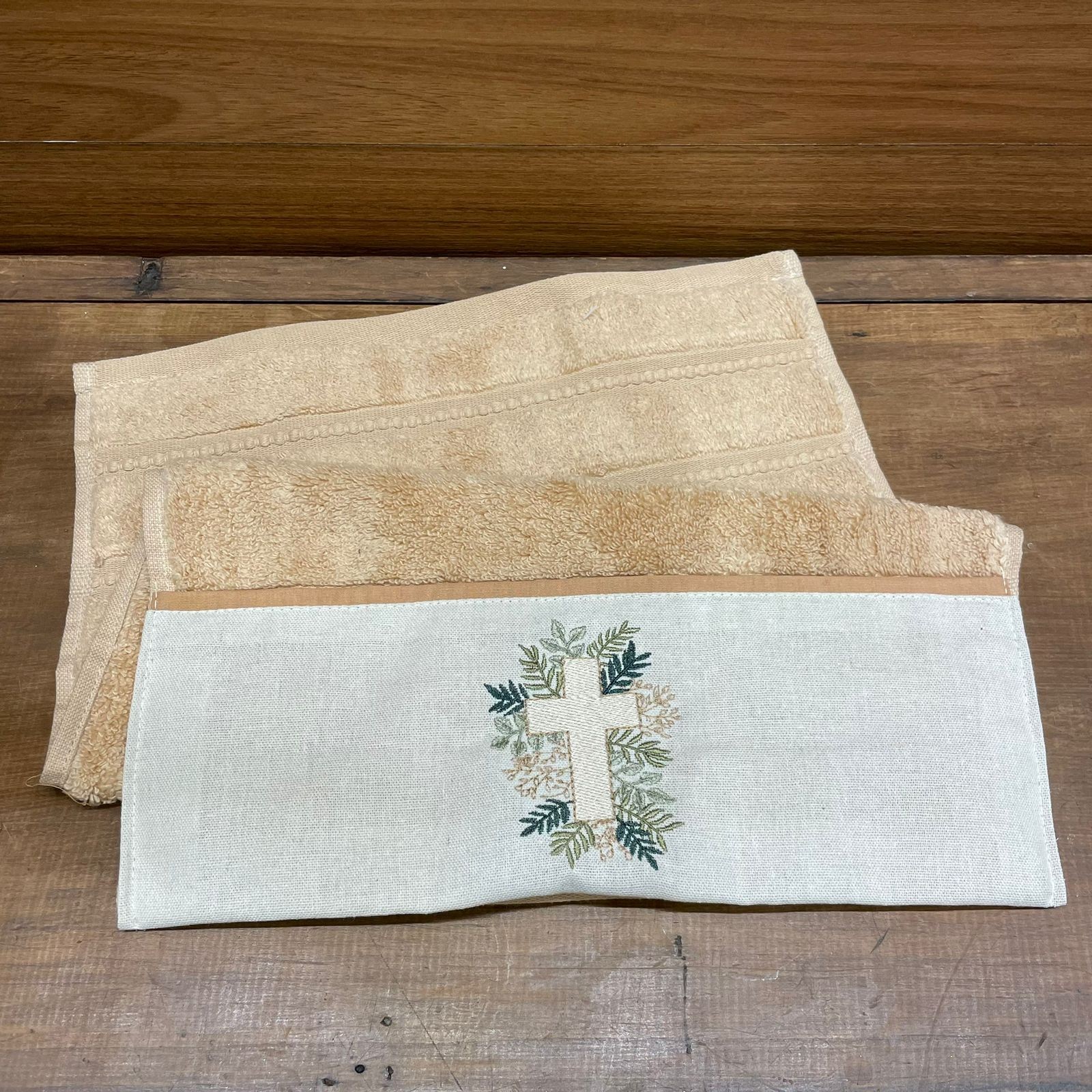 Cor: Toalha tom salmão com bordado de cruz e ramos em tons de bege
