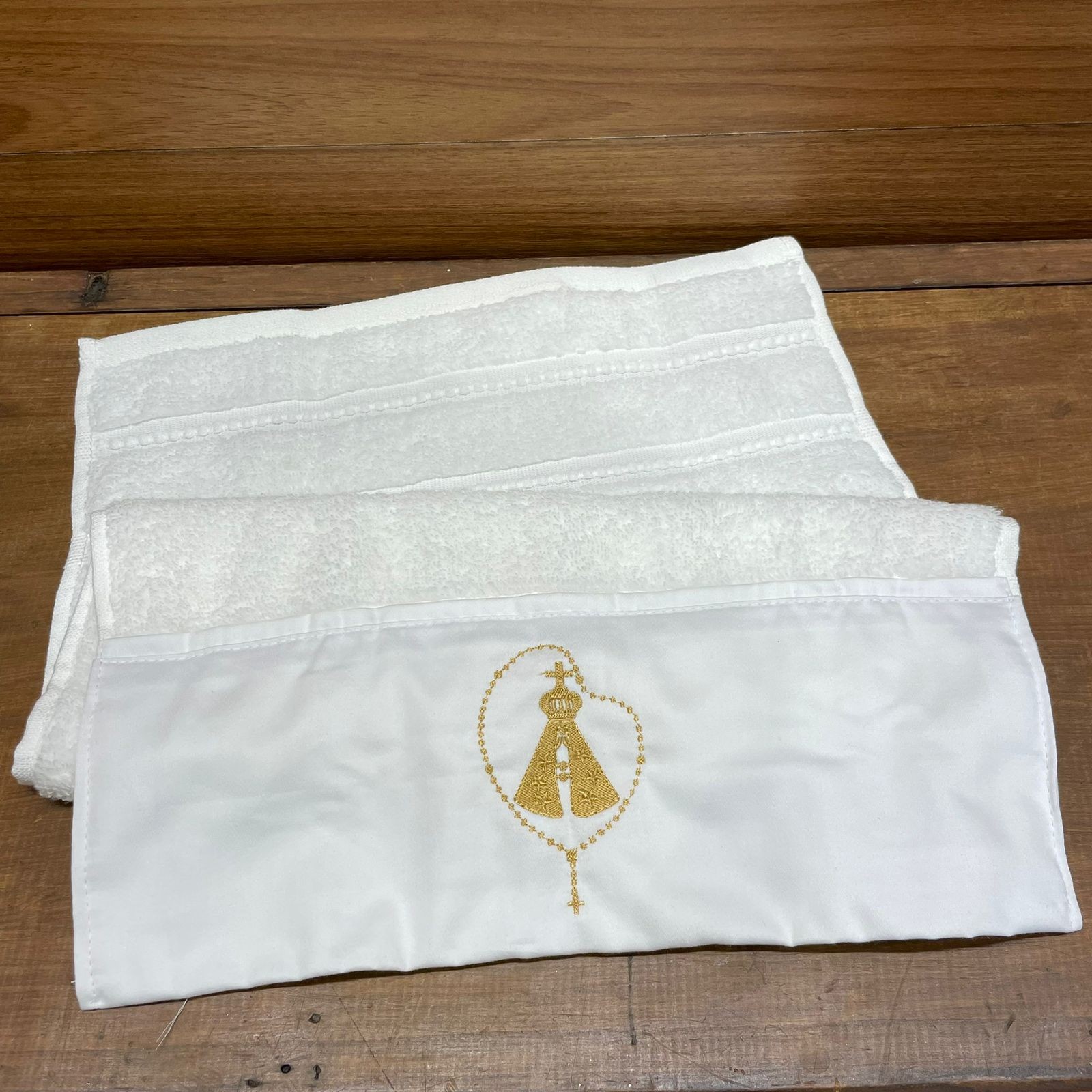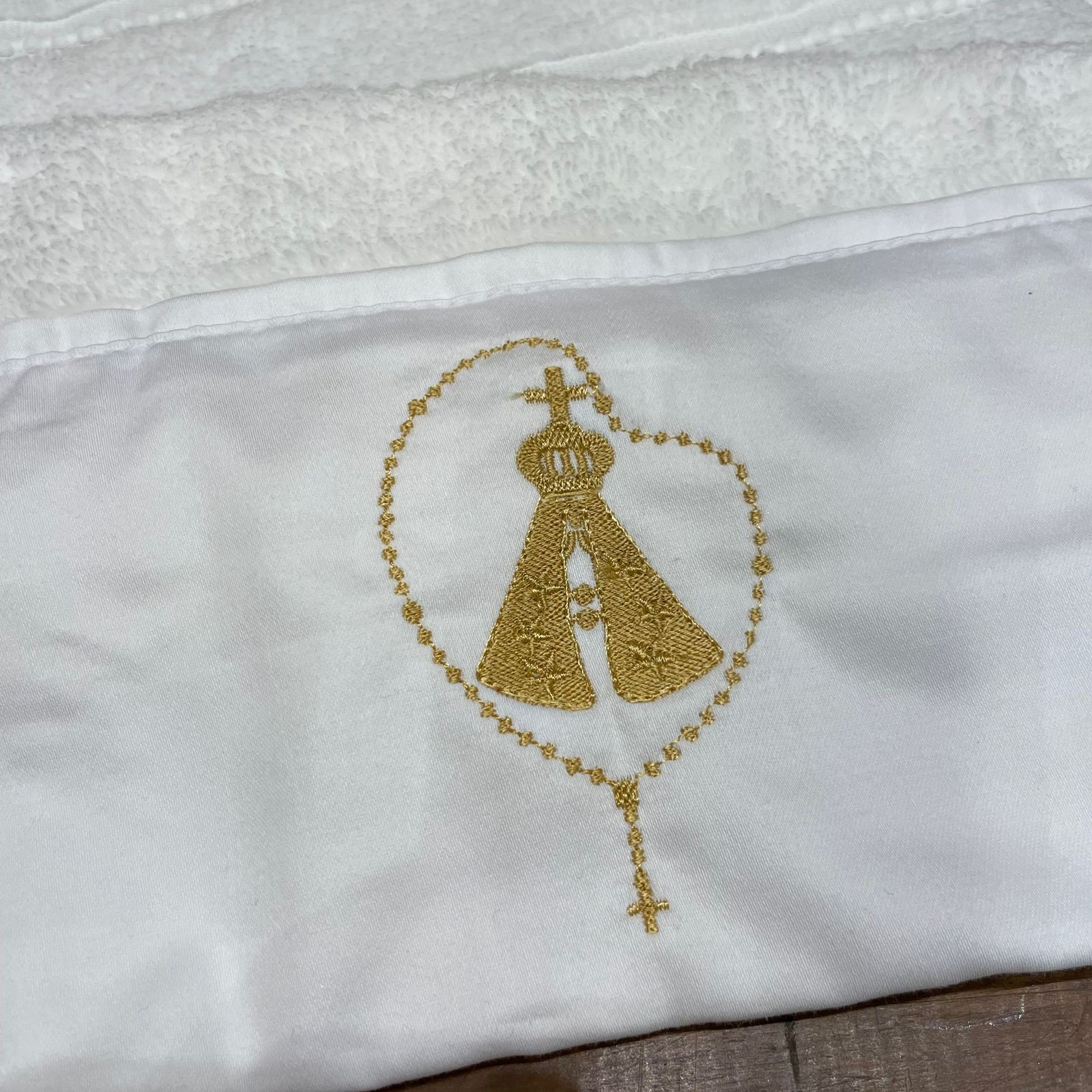 Toalha de lavabo na cor branca, modelo Baby Skin da Buddemeyer, com bordado delicado de Nossa Senhora Aparecida no dourado.