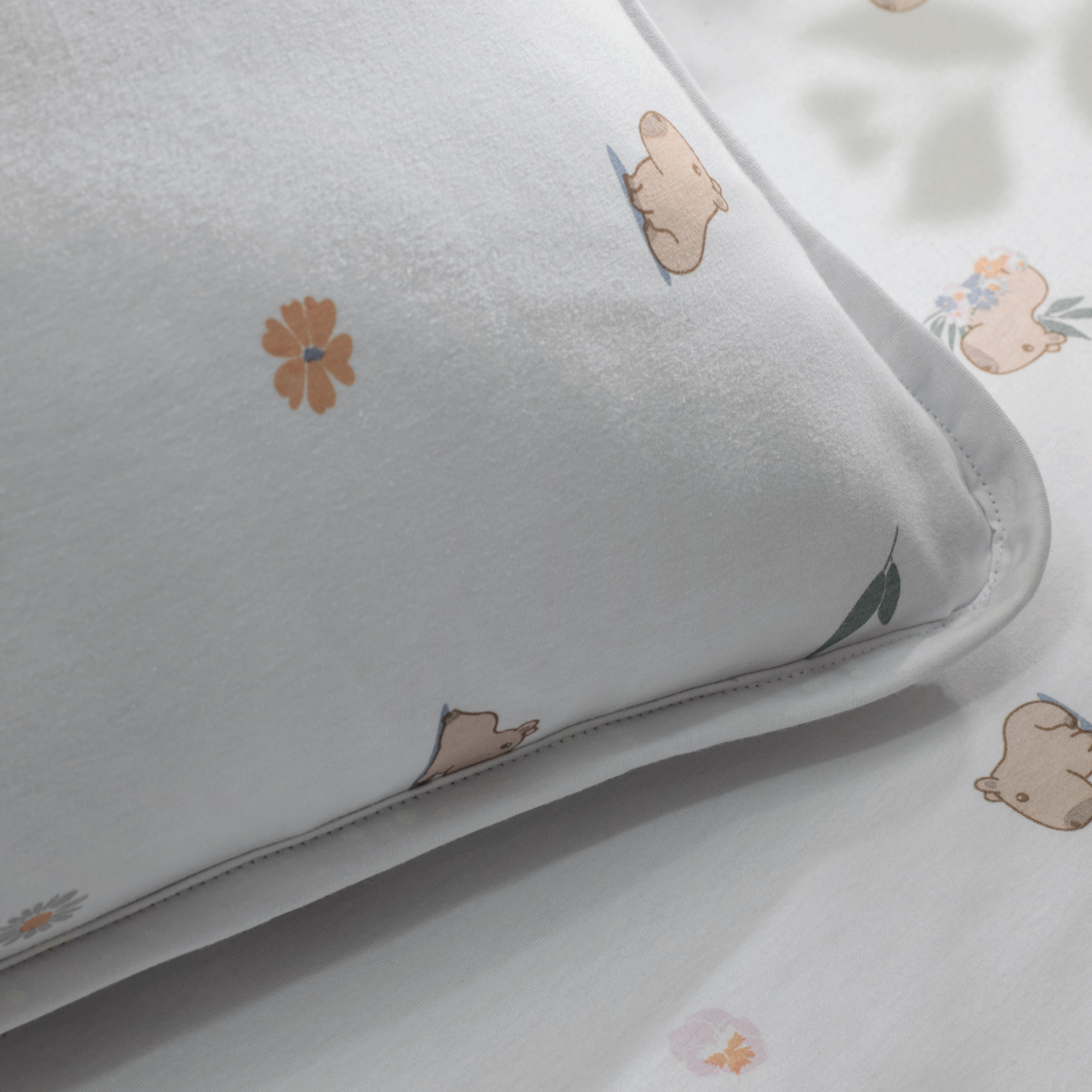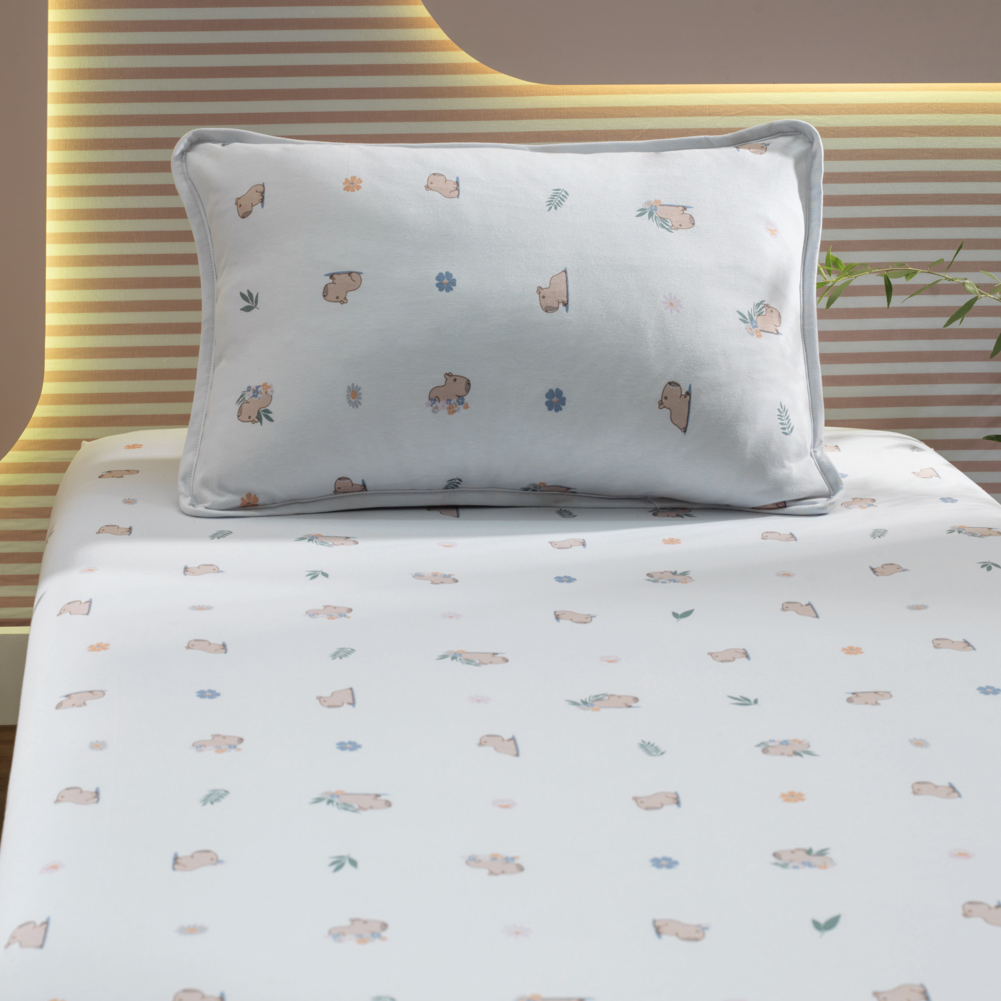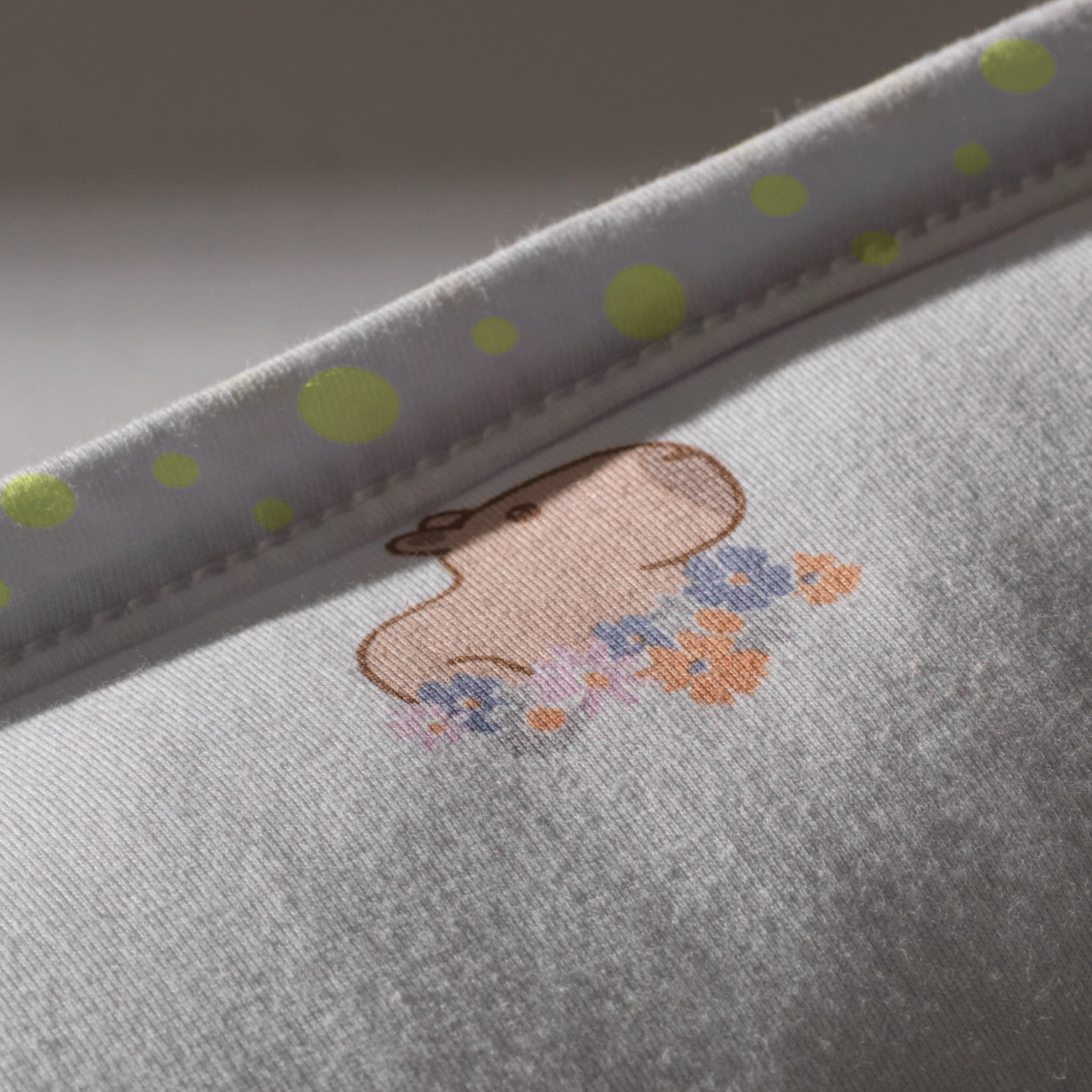 A estampa Capi traz a doçura da simpática capivara para dentro do quarto! Com ilustrações delicadas do animal em diferentes poses, acompanhadas de flores e folhagens, ela cria um cenário lúdico e cheio de alegria. A paleta em tons suaves de rosa, bege e cinza transmite leveza e tranquilidade, deixando o ambiente ainda mais aconchegante. Além de encantadora, é perfeita para garantir noites tranquilas e cheias de conforto.