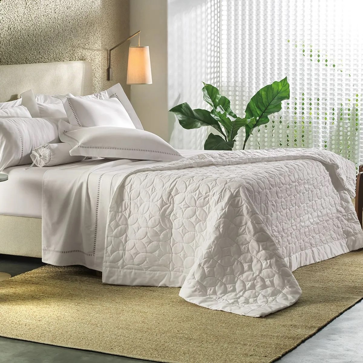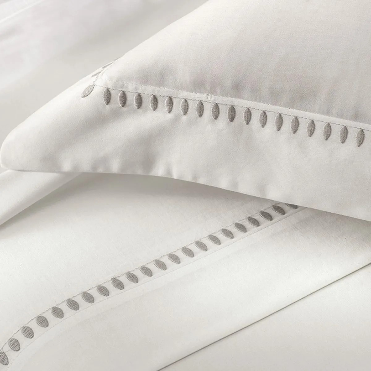 Elegância que se revela nos detalhes. O jogo de cama Cerclê encanta pelo bordado delicado em padrão circular, que remete à leveza e ao movimento do artesanato contemporâneo. As fronhas ganham destaque com o contorno bordado em quatro abas de 6cm, criando um visual sofisticado e acolhedor, com fechamento envelope para um acabamento impecável.