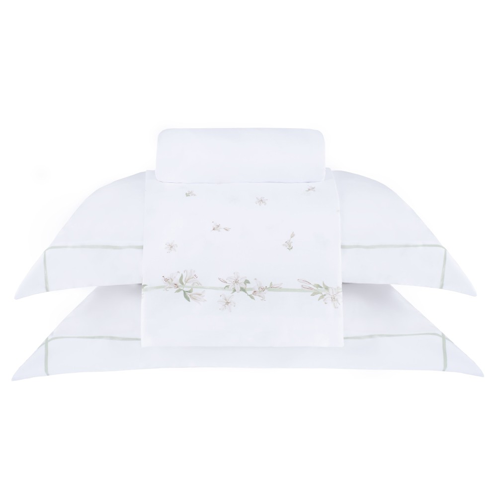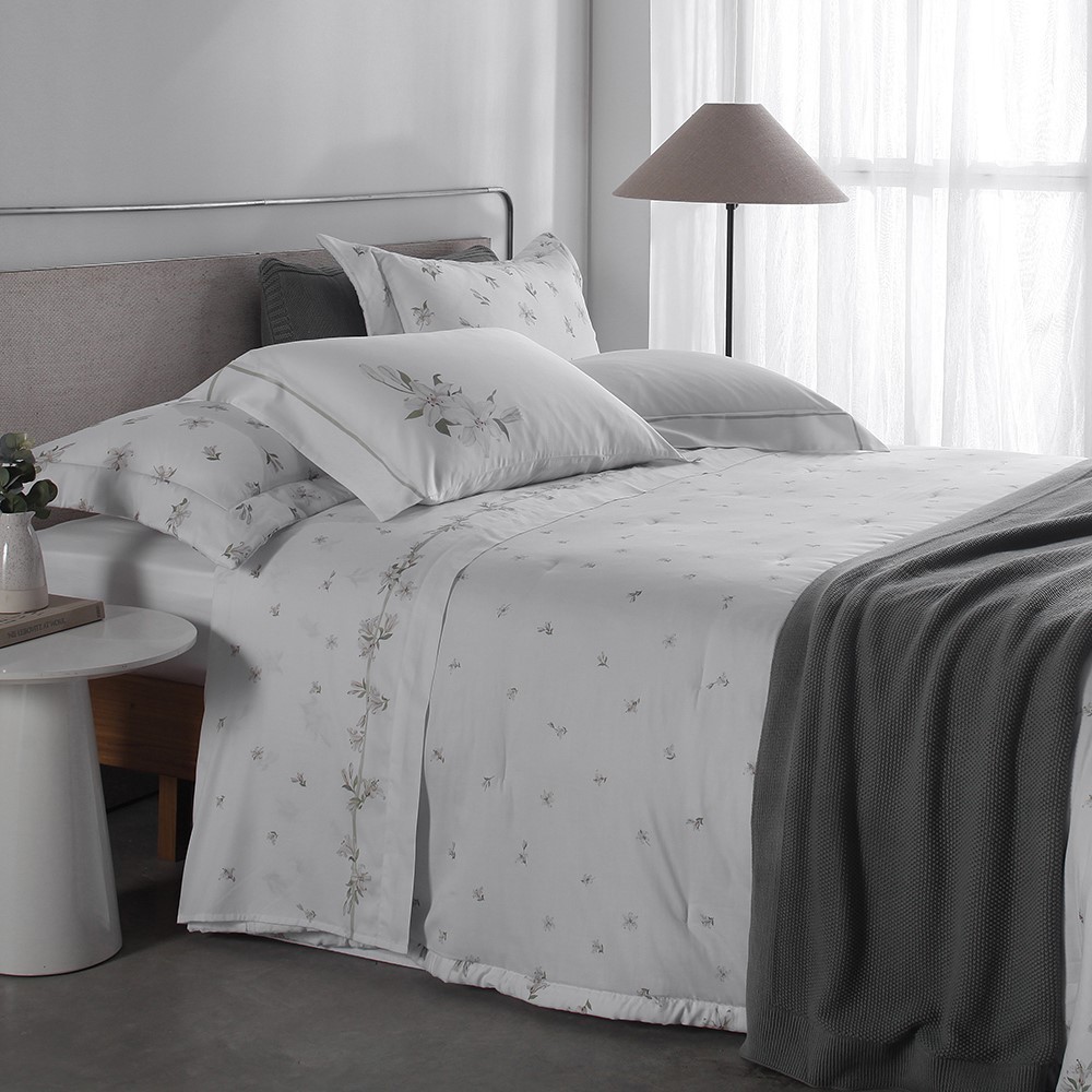 Extremamente sofisticado, em aconchegantes 300 fios de cetim de algodão, o jogo de lençol Gaya possui a leveza das melhores sensações. Símbolo de romantismo e pureza, a beleza de lírios aquarelados preenche todo o modelo com elegância ímpar. Na vira do sobrelençol e fronhas, a moldura diferenciada em tons esverdeados, enriquece o acabamento com charme e modernidade. Seu toque sedoso é incrivelmente macio e aconchegante, promovendo conforto em seu ápice. Qualidade e design Buddemeyer.