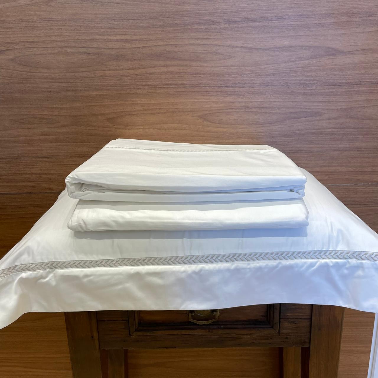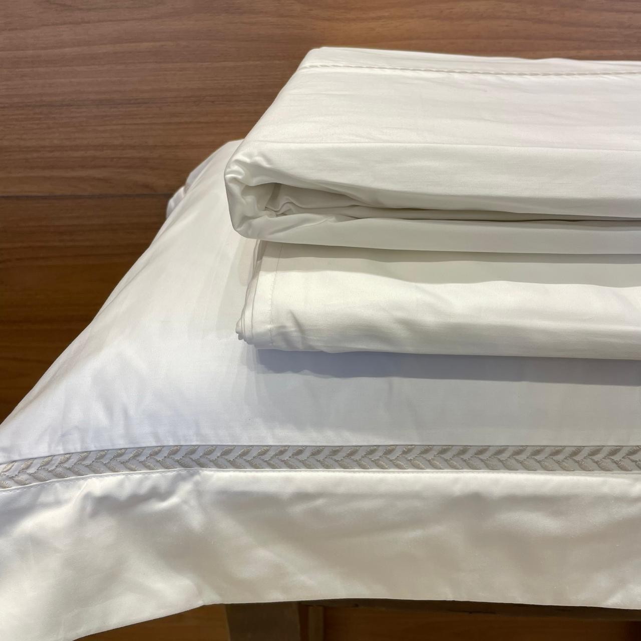 Acabamento: Fronha com 3 abas; Lençol de baixo liso e sem elástico; Toque acetinado.