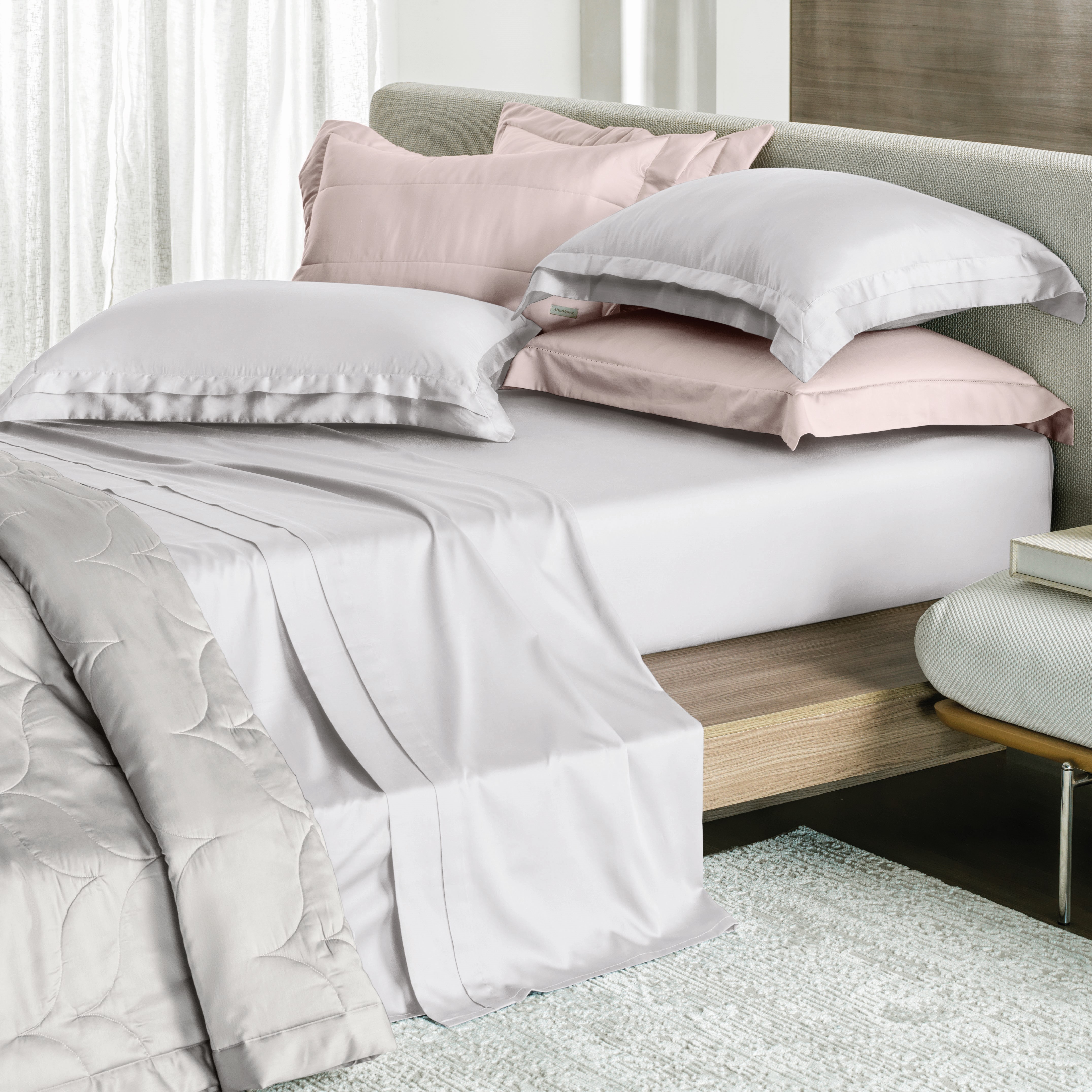 O jogo de cama Allure Altenburg é uma novidade sofisticada que traz elegância e modernidade ao seu quarto. Confeccionado em cetim de 300 fios, oferece um toque macio e confortável. Seu design apresenta uma sobreposição de abas que formam uma cascata minimalista, adicionando um charme contemporâneo ao quarto. Sua versatilidade permite combinar facilmente com diversos outros produtos.