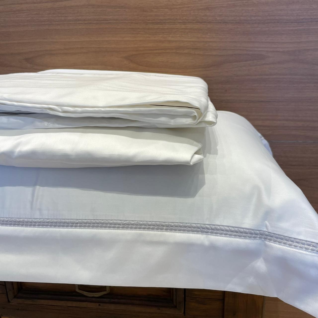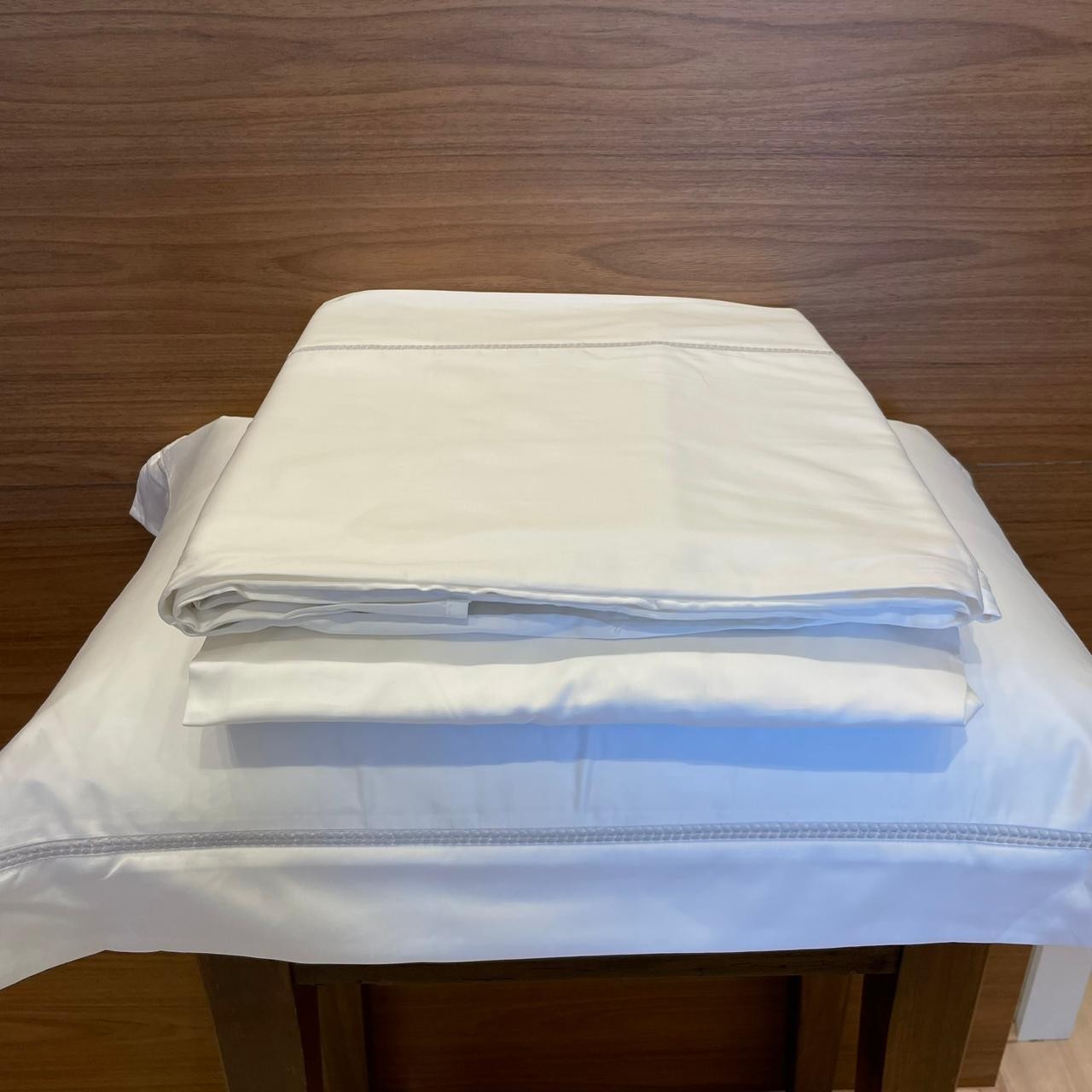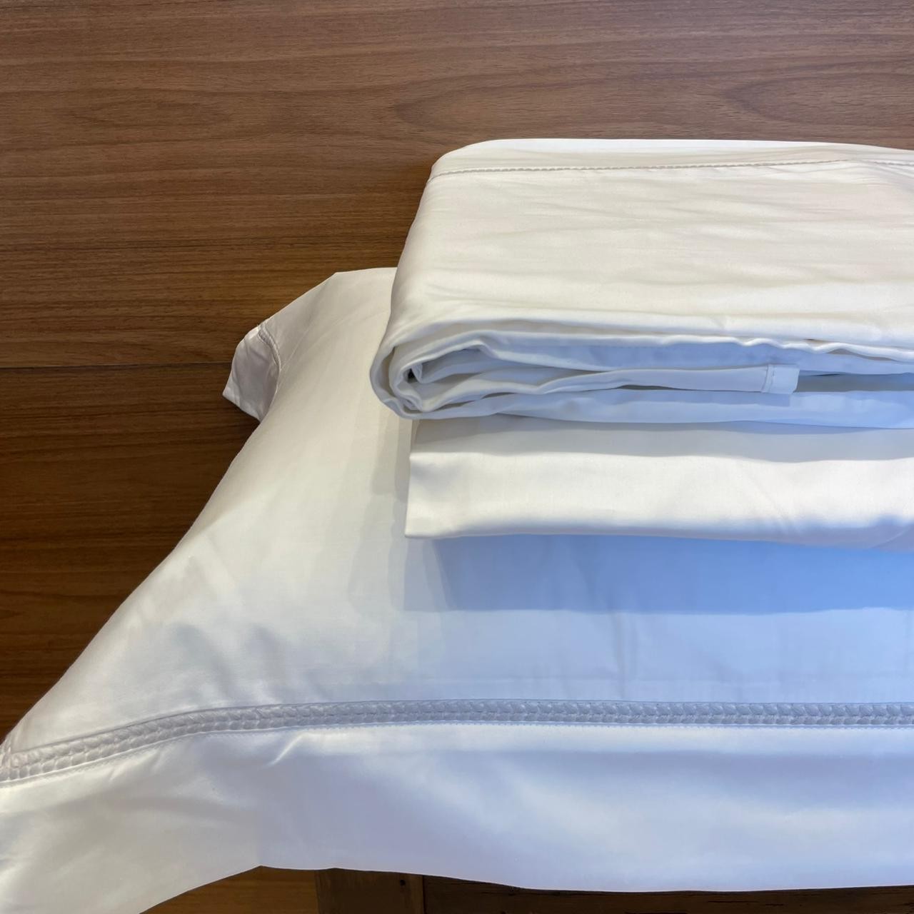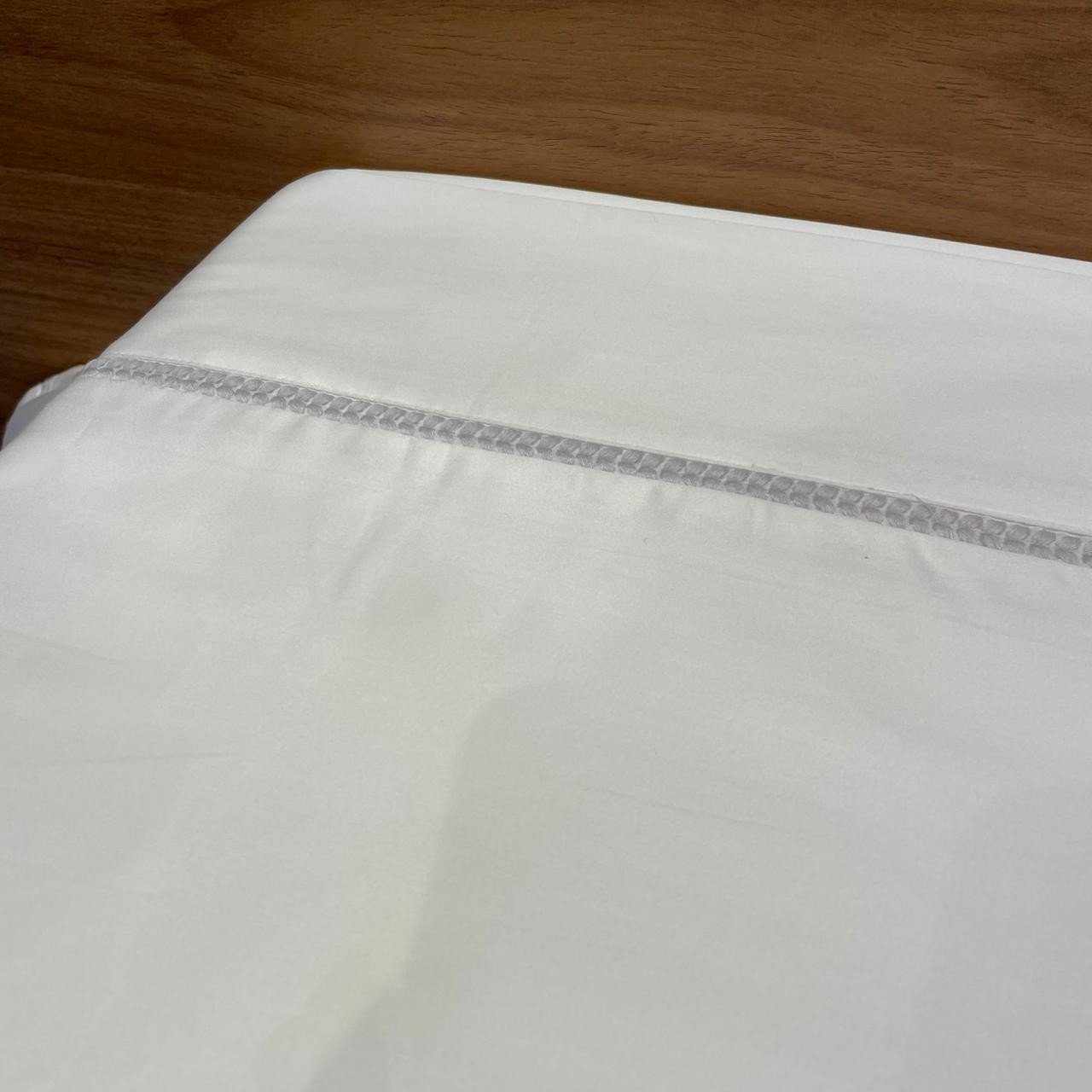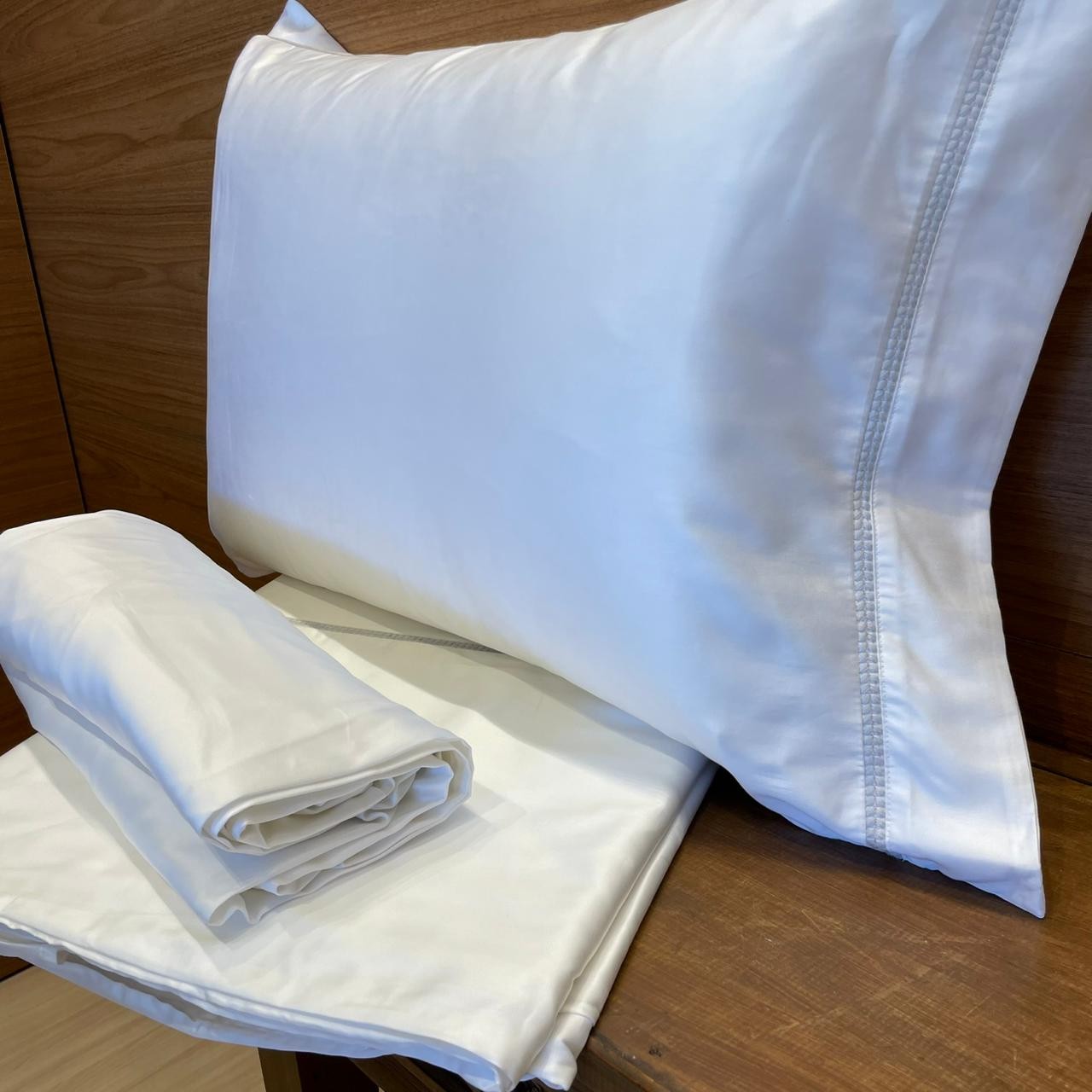 Acabamento: Fronha com 3 abas; Lençol de baixo liso; Toque acetinado.