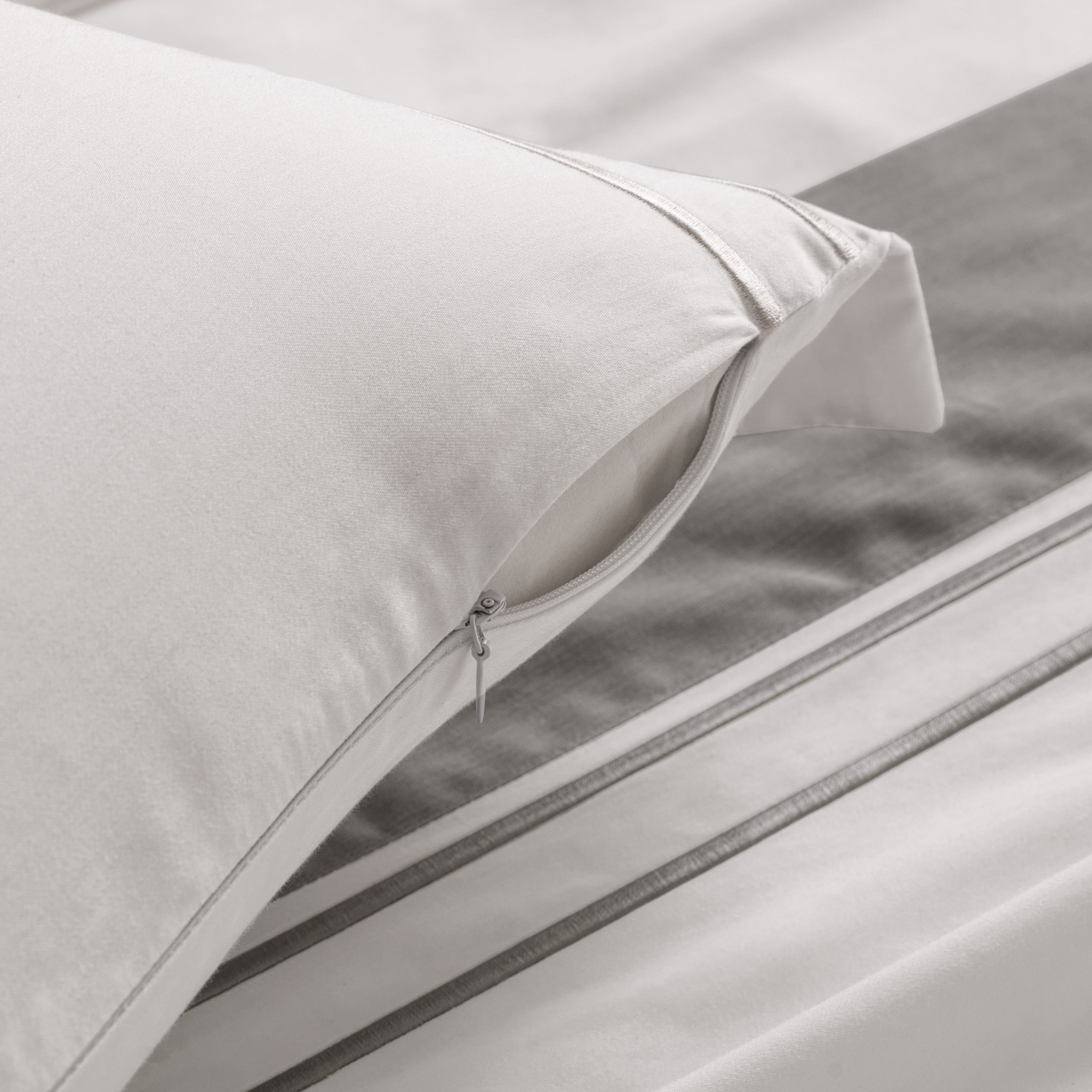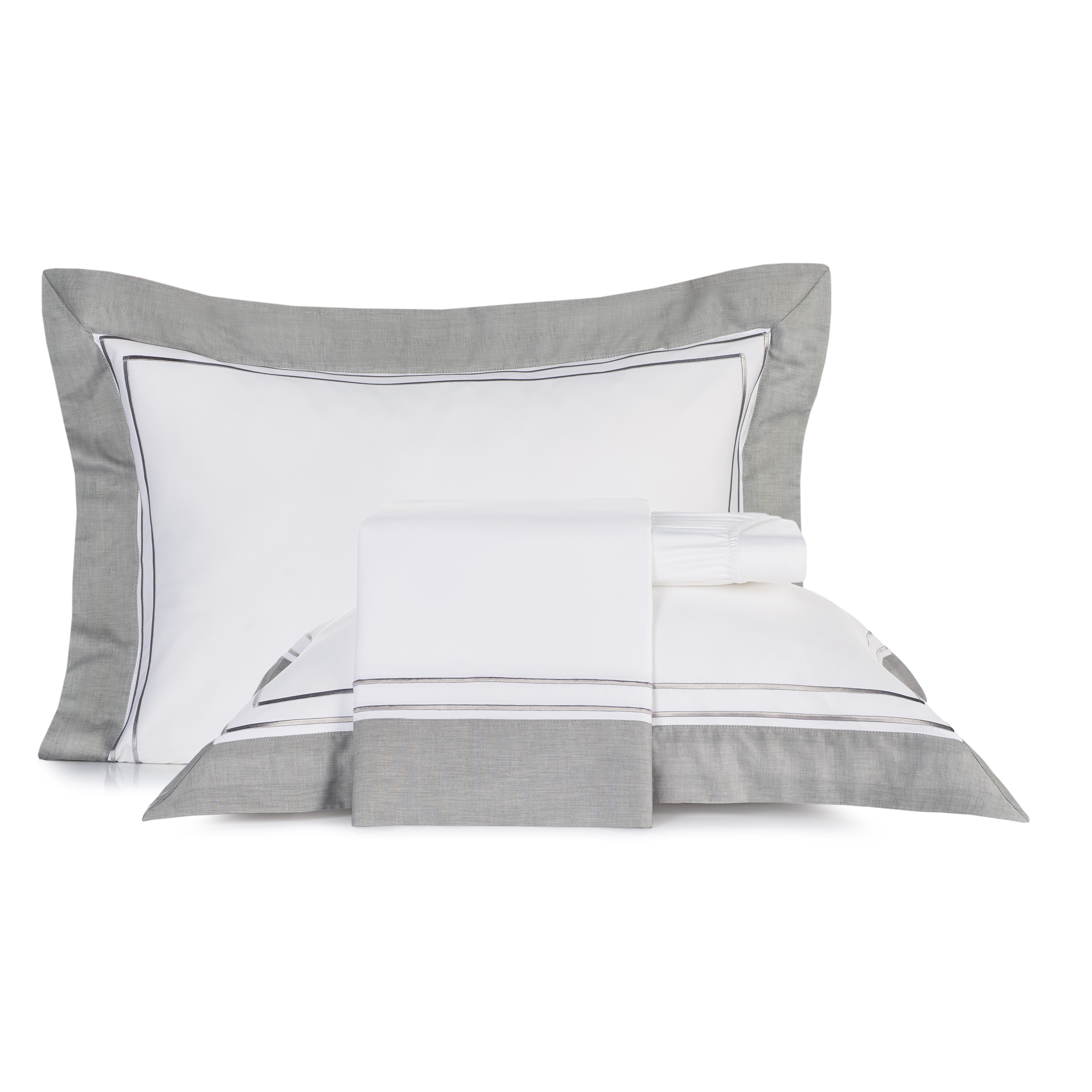 O jogo de lençol Essential em cetim 300 fios combina o toque acetinado do tecido com o design minimalista e o acabamento bordado em tom cinza — um clássico atemporal que traz elegância e conforto incomparáveis ao seu quarto.