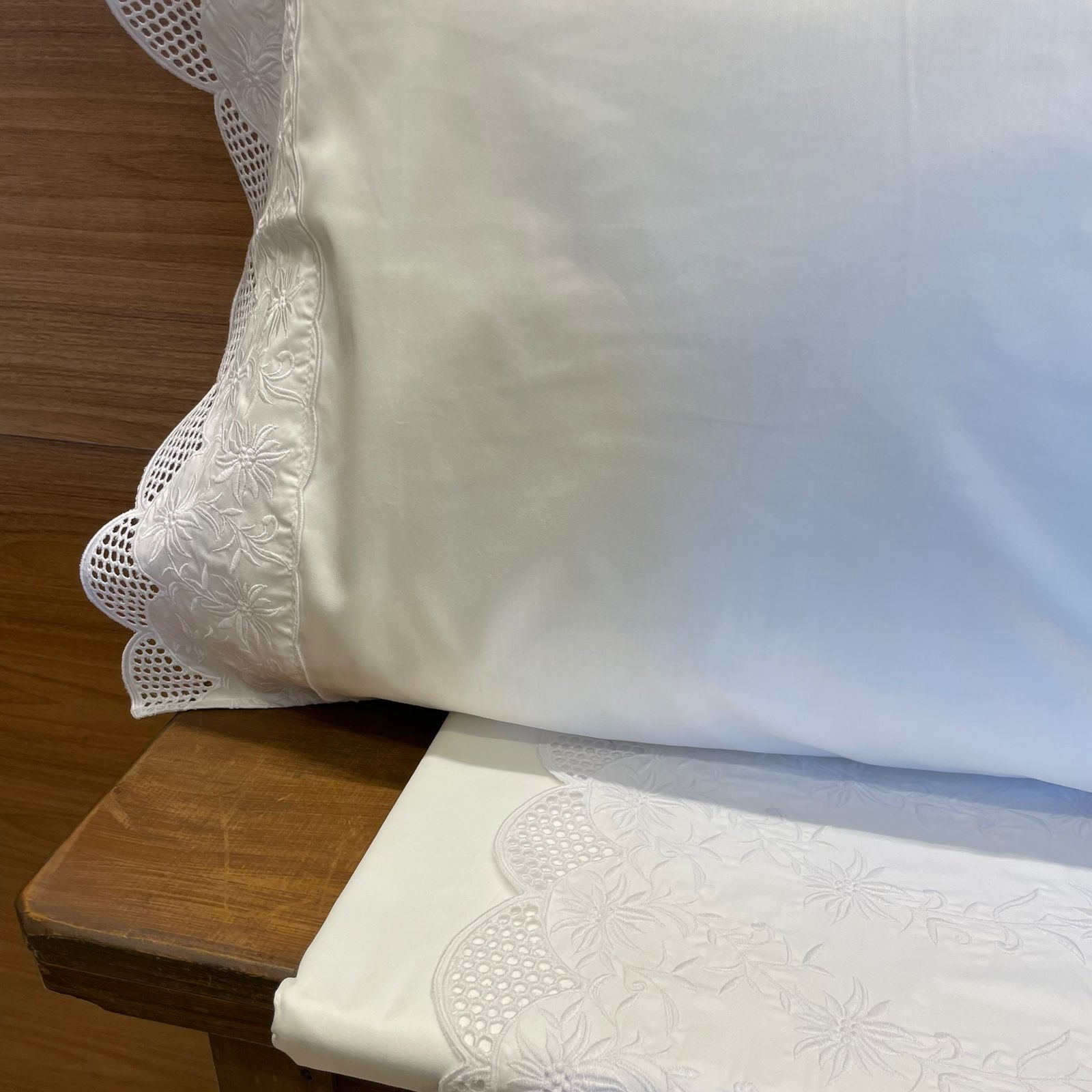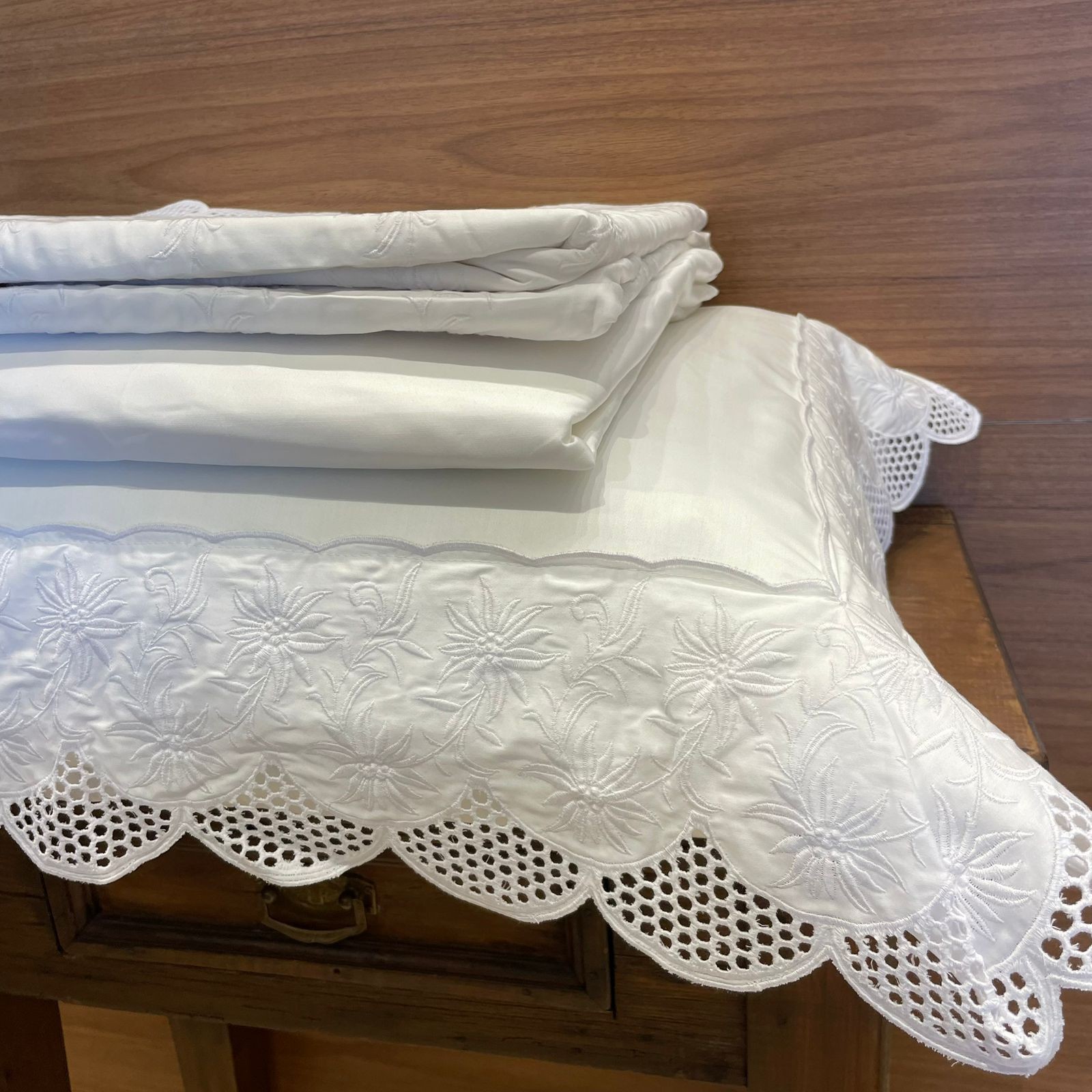 Inspirado na Edelweiss, flor rara que simboliza pureza, elegância e amor duradouro, este jogo de lençol carrega a beleza da natureza aliada ao luxo têxtil, criando um ambiente acolhedor, romântico e atemporal para noites de descanso especiais.