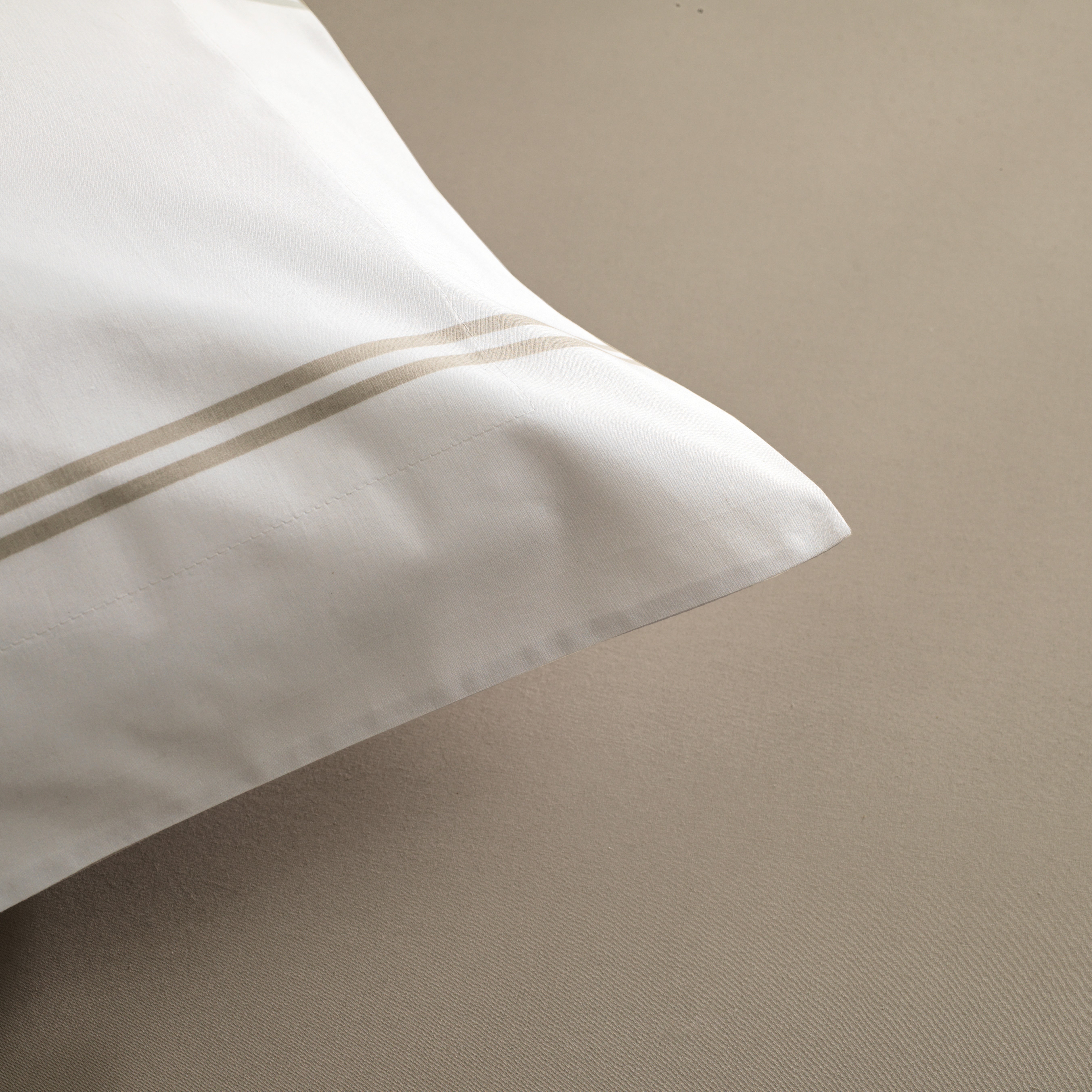 O jogo de cama Riviera é confeccionado em 100% algodão, com 200 fios, garantindo um toque confortável de fibra natural. Seu design clean combina o branco com o contraste elegante da barra em tom neutro, criando um visual leve e refinado para o quarto. Ideal para quem busca conforto e elegância em uma só peça.