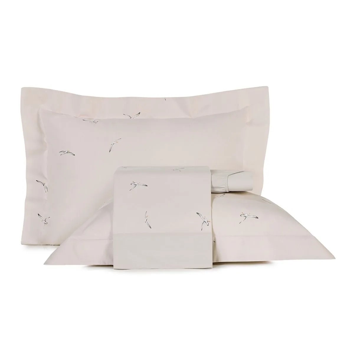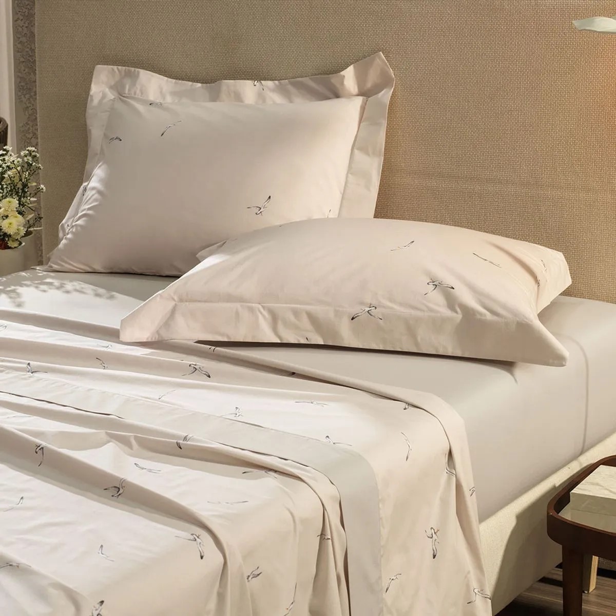 O jogo de cama Volare – que em italiano significa “voar” – traz uma estampa suave com pássaros estilizados em voo, que adicionam leveza e um toque poético ao ambiente. Confeccionado em algodão, oferece toque macio, frescor e uma experiência de descanso ainda mais agradável. Ideal para quem busca beleza, conforto e um estilo clean no quarto.