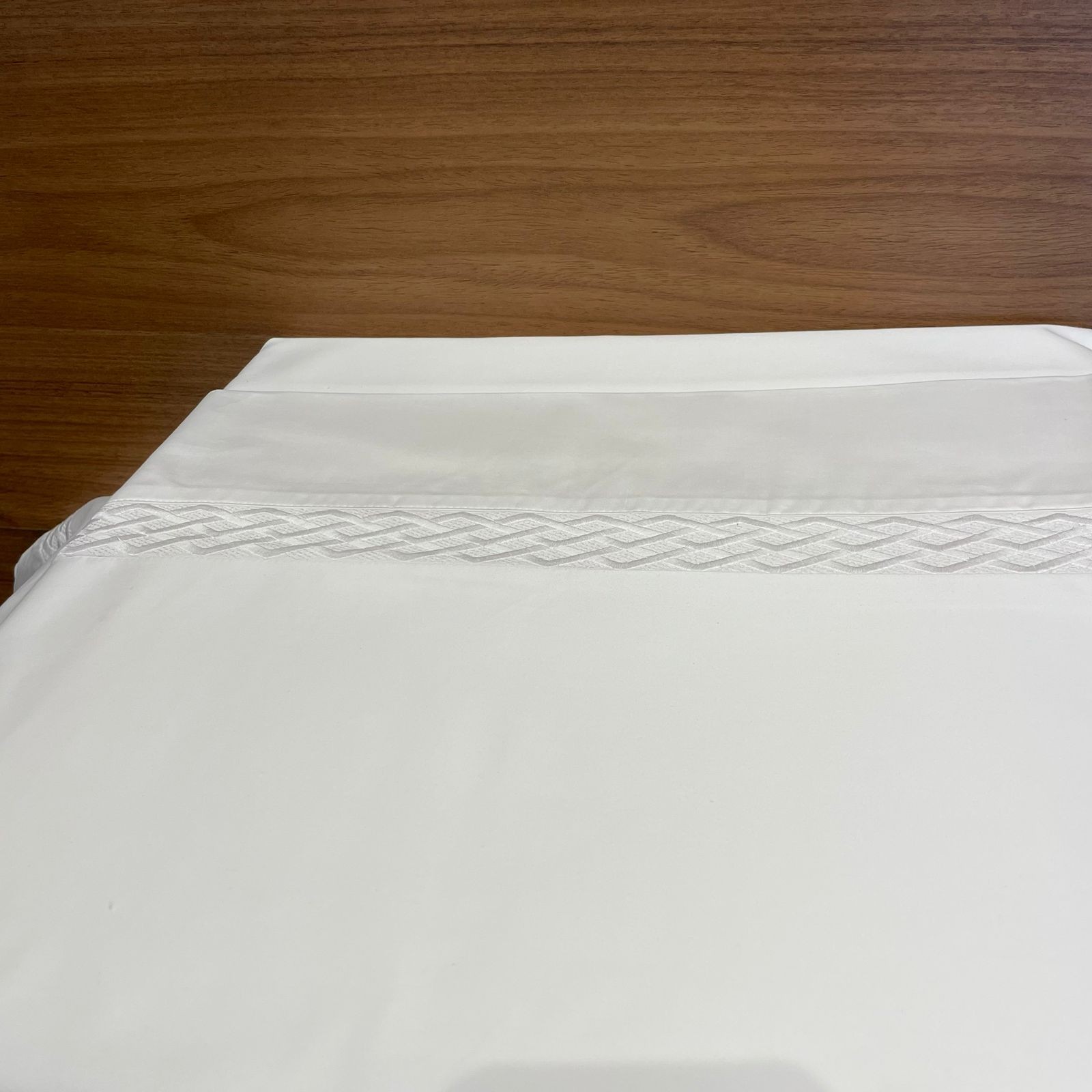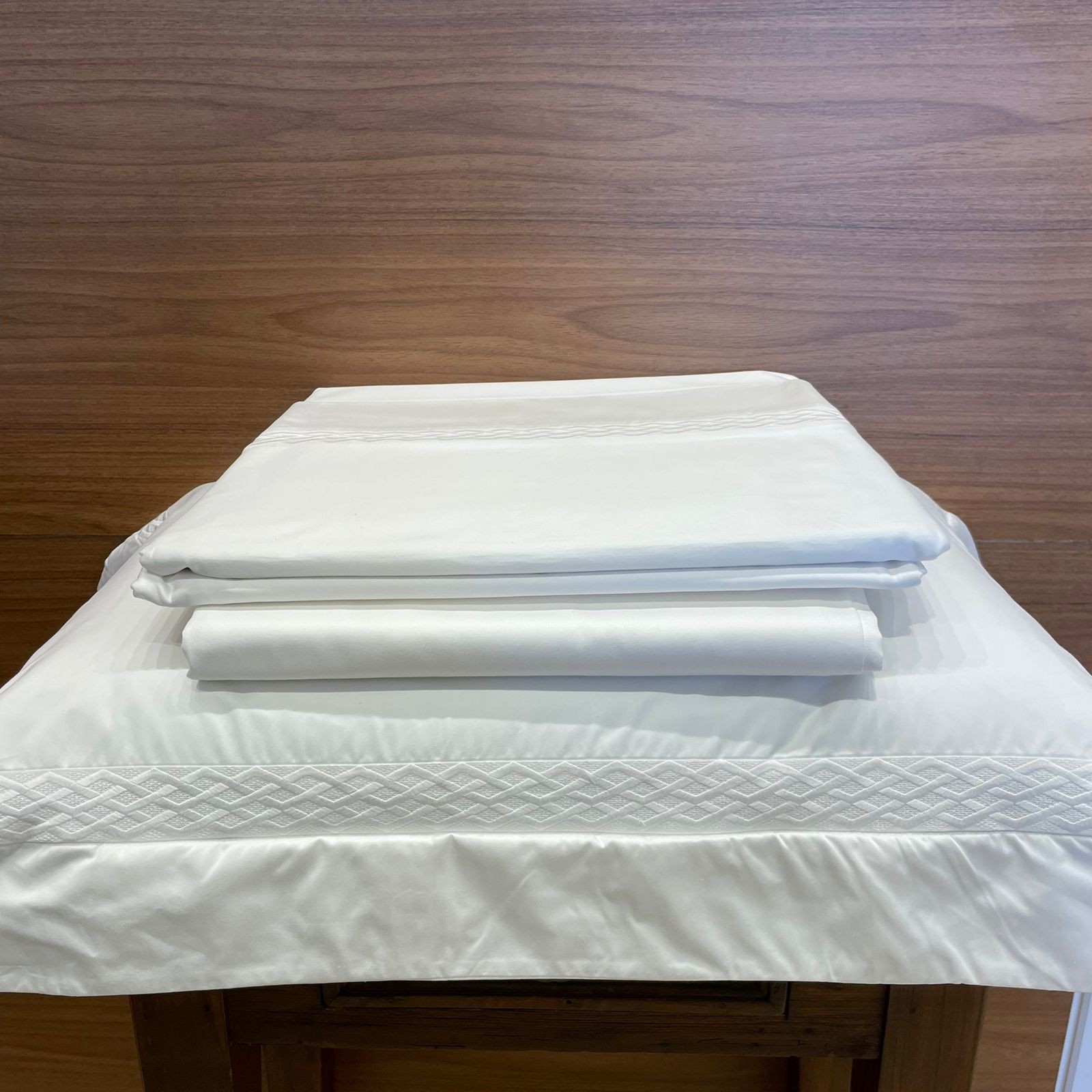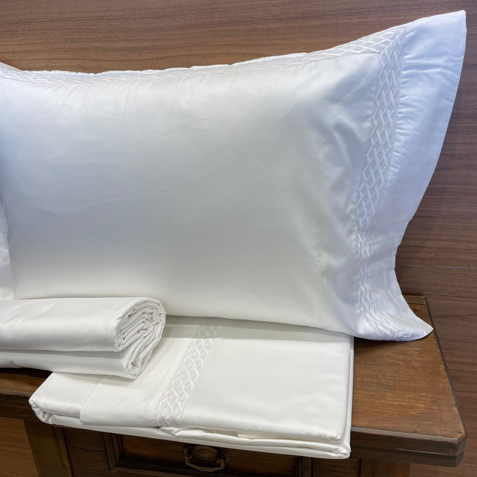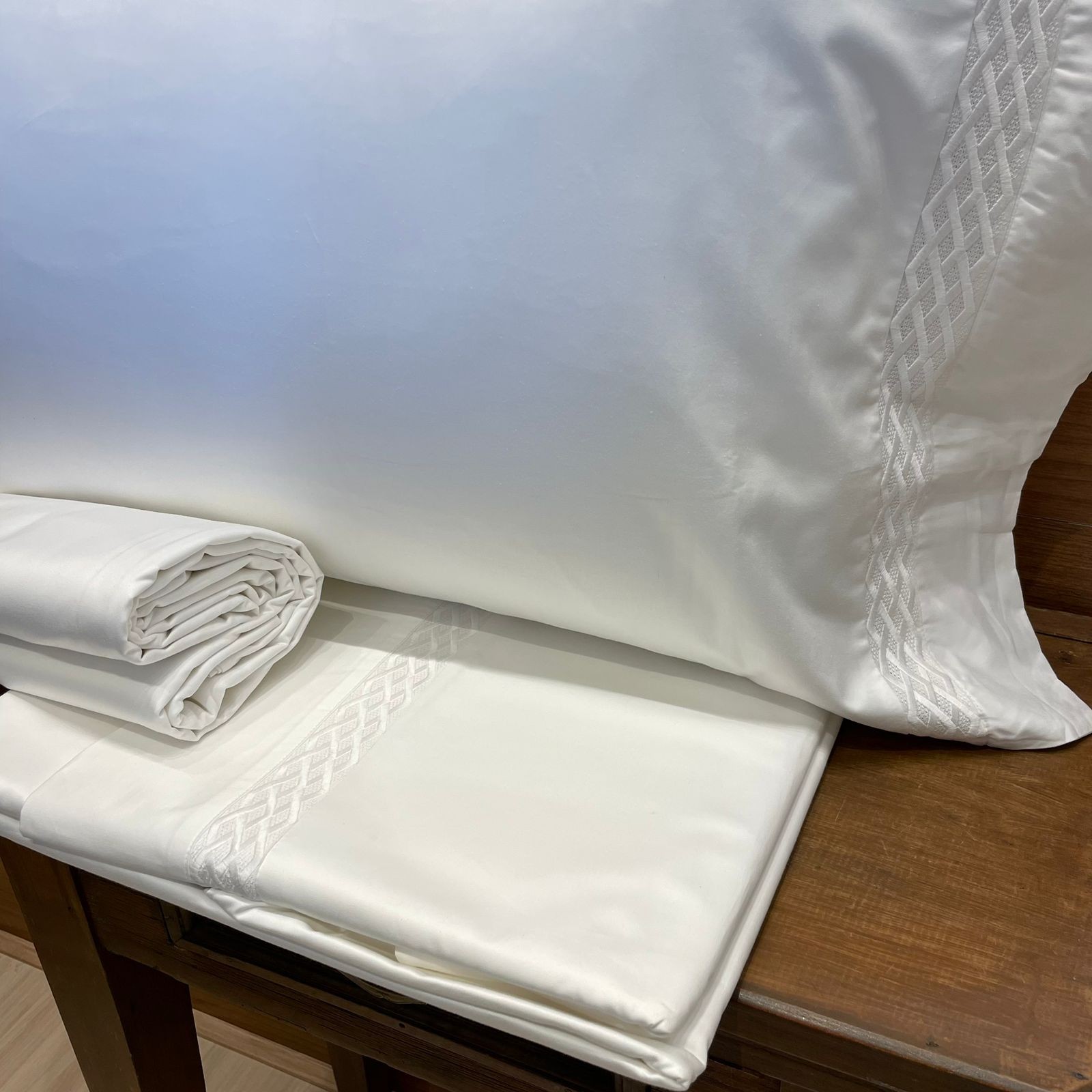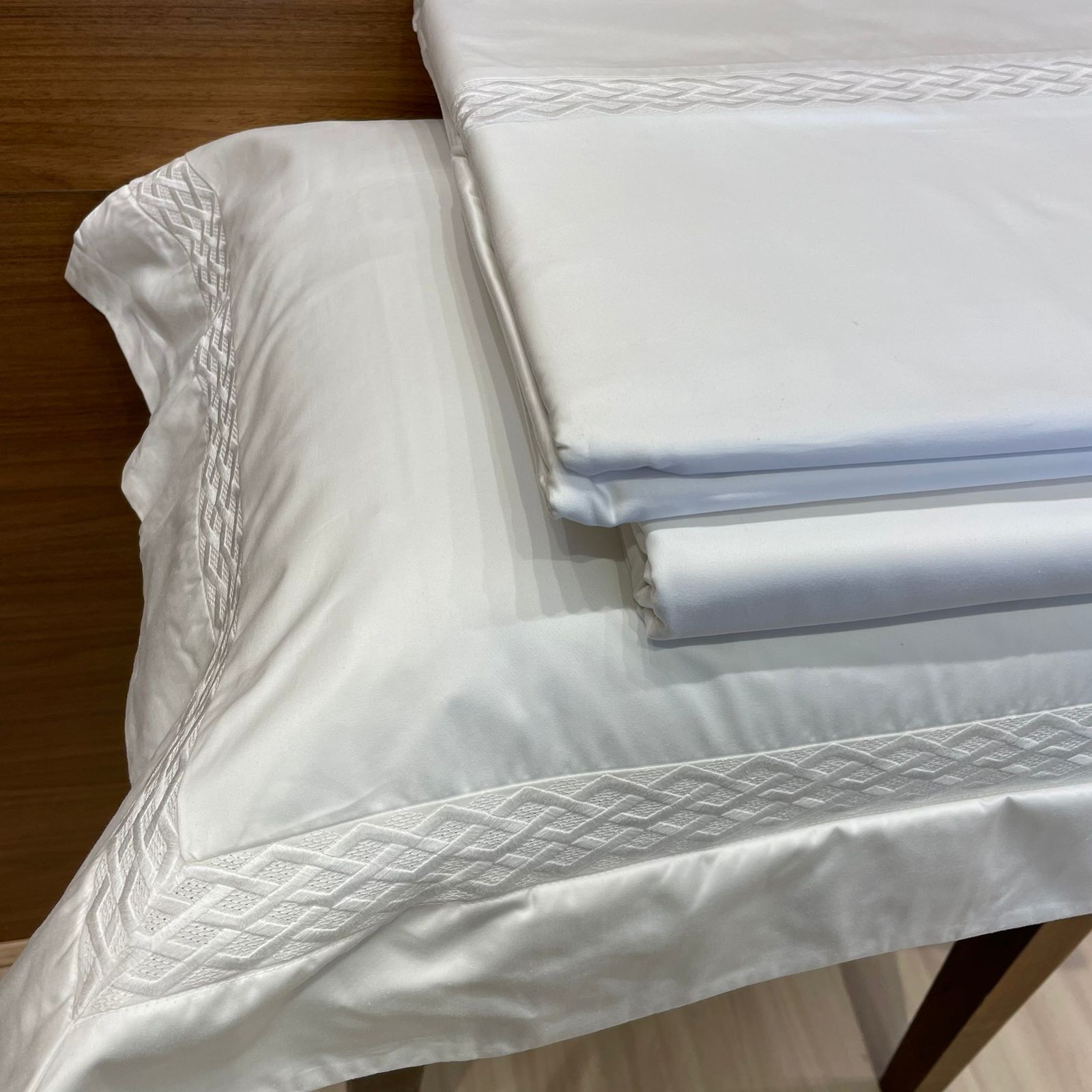 O Reticello 1000 fios é a tradução do luxo atemporal. Em tom branco puro, traz um acabamento impecável com detalhe reticello bordado, que percorre o tecido com um desenho geométrico delicado e extremamente sofisticado.
