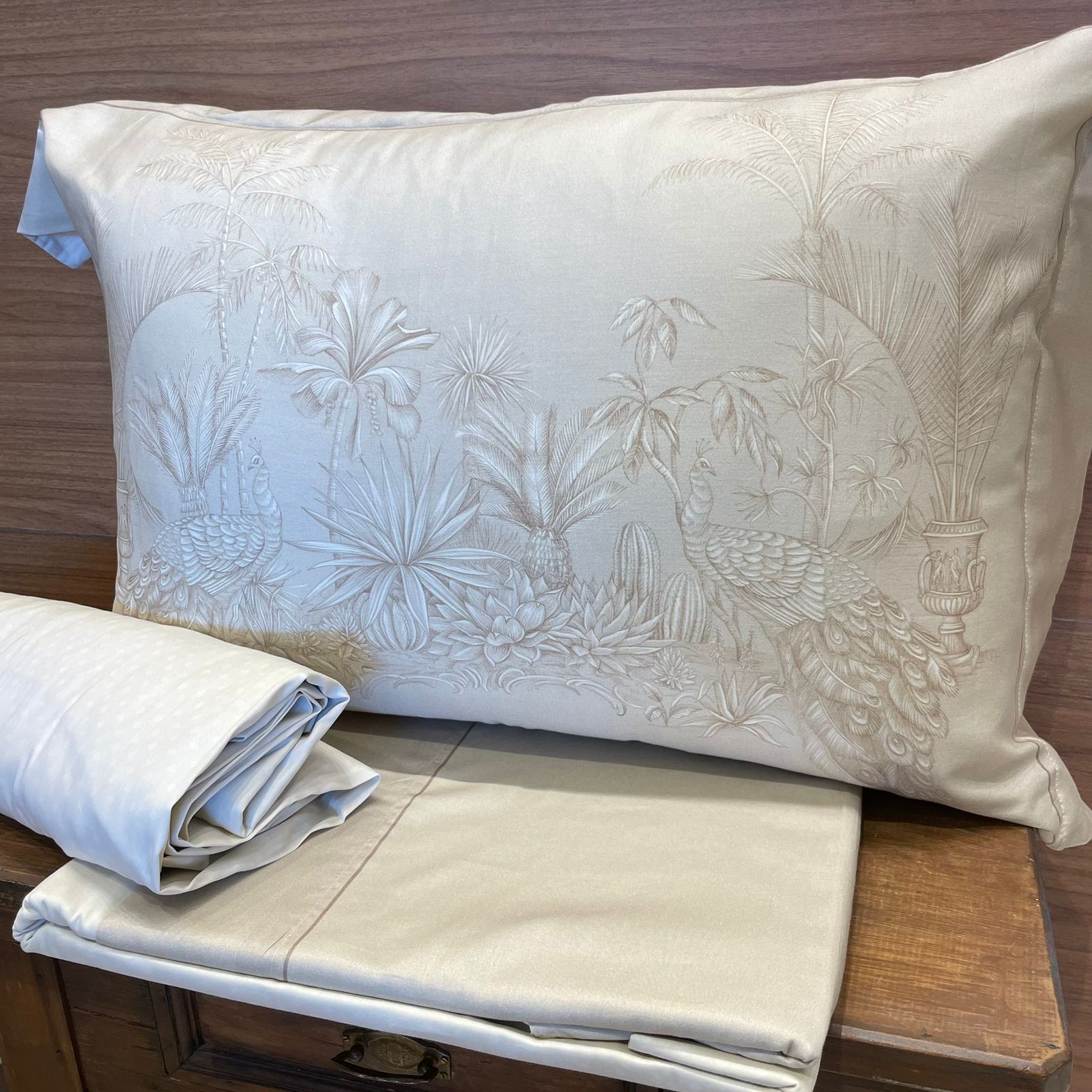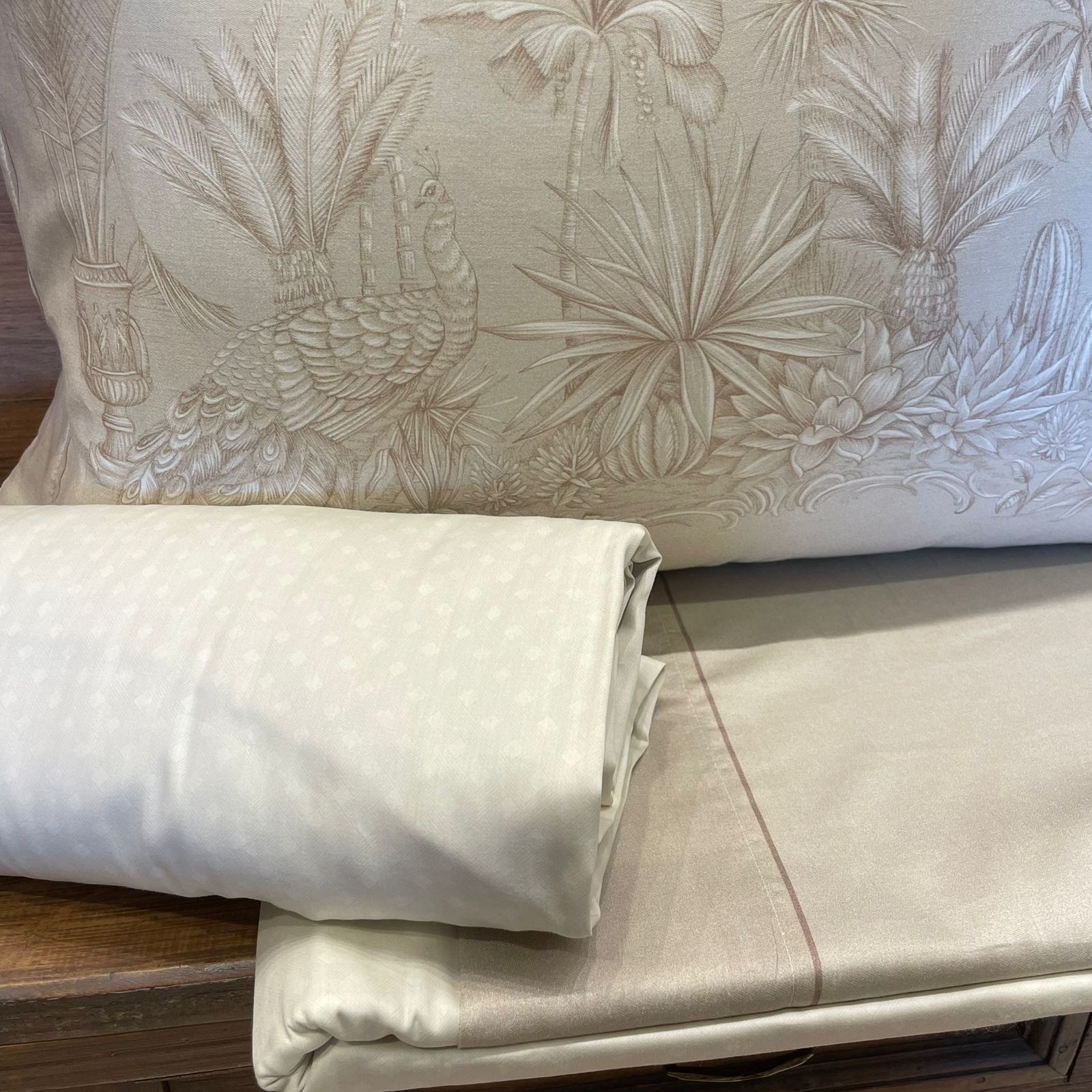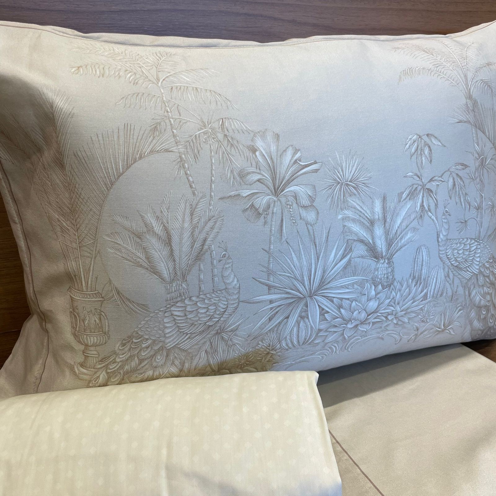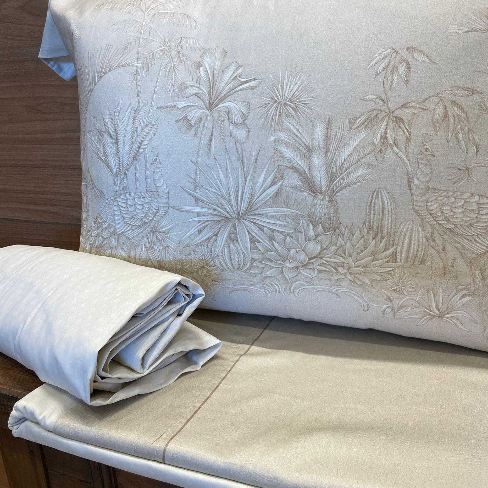 O jogo de lençol Villa Ravino, da Trussardi, inspira-se na natureza. Confeccionado em cetim 300 fios, oferece toque acetinado, macio e envolvente, que transforma o descanso em uma experiência de conforto absoluto. Sua estampa com elementos naturais e tons suaves, adiciona sofisticação e leveza à cama, criando um ambiente acolhedor, elegante e atemporal.
