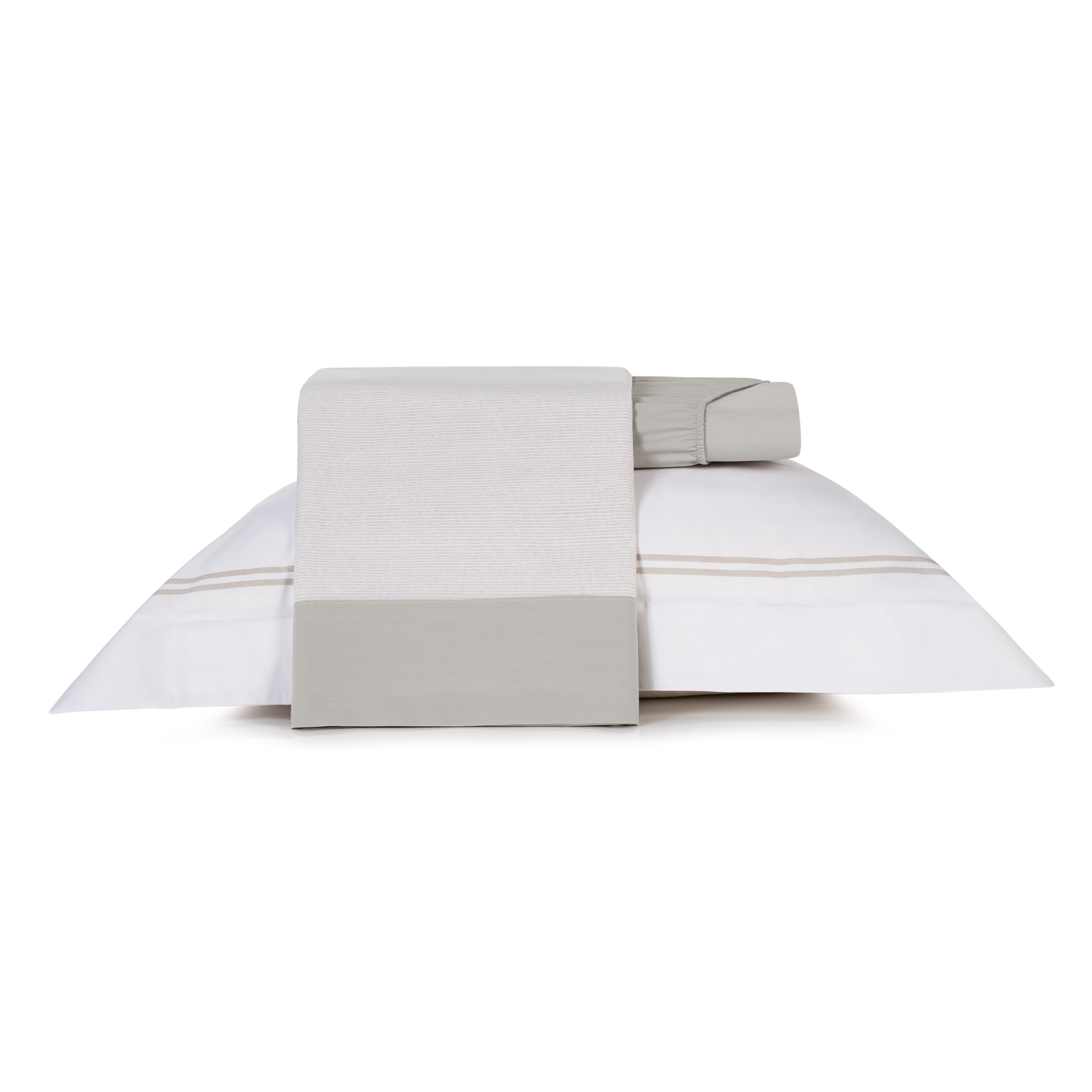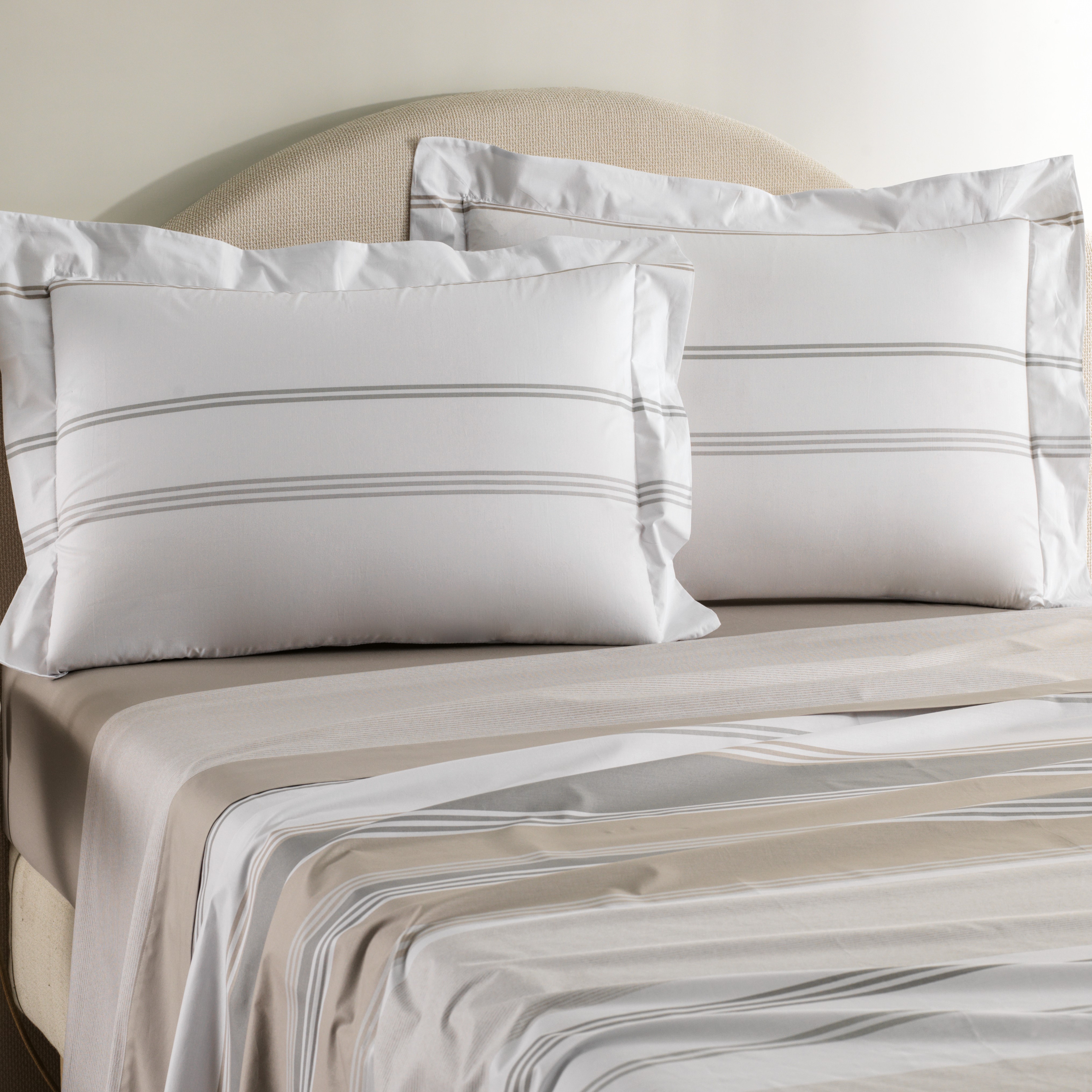 O jogo de cama Riviera é confeccionado em 100% algodão, com 200 fios, garantindo um toque confortável de fibra natural. Seu design clean combina o branco com o contraste elegante da barra em tom neutro, criando um visual leve e refinado para o quarto. Ideal para quem busca conforto e elegância em uma só peça.