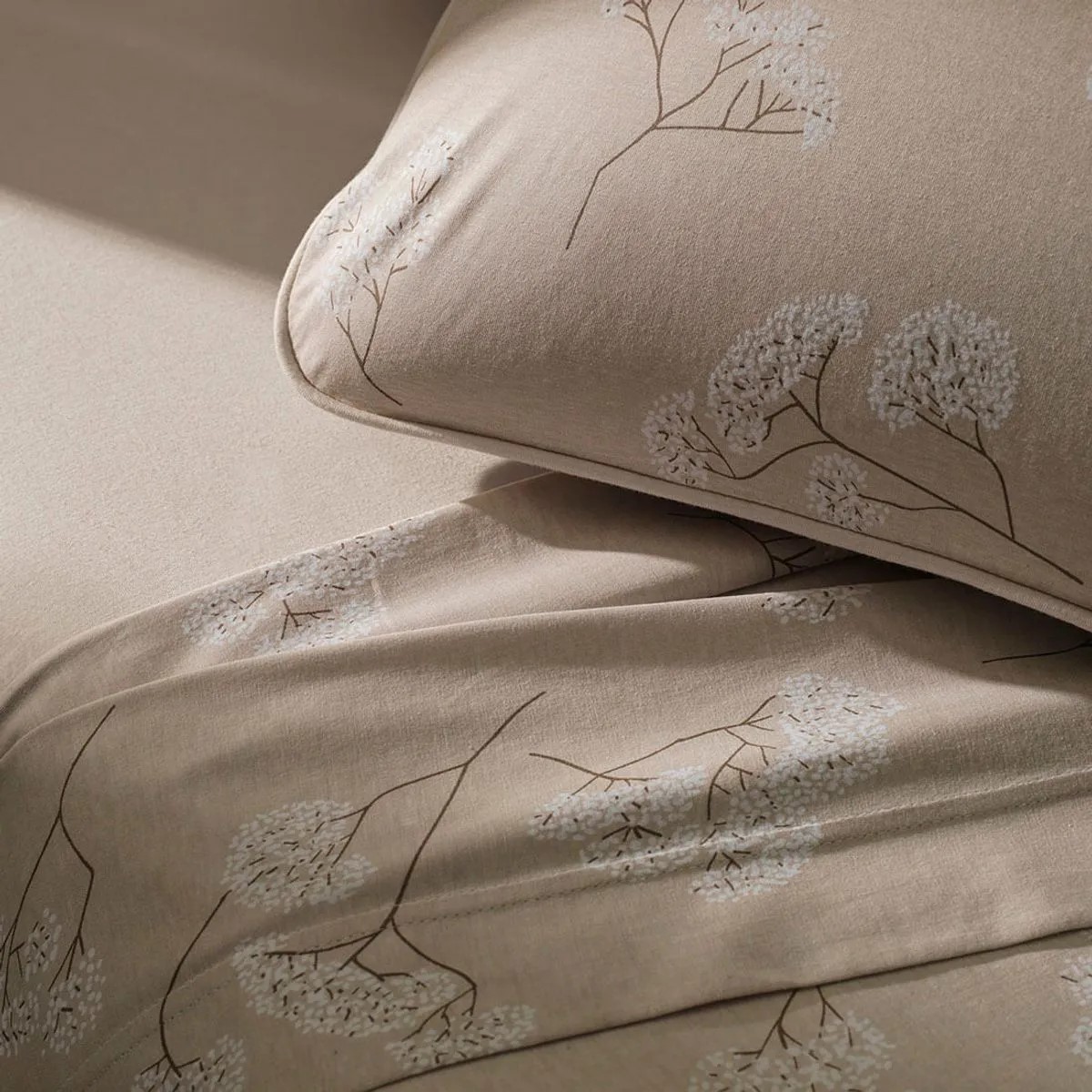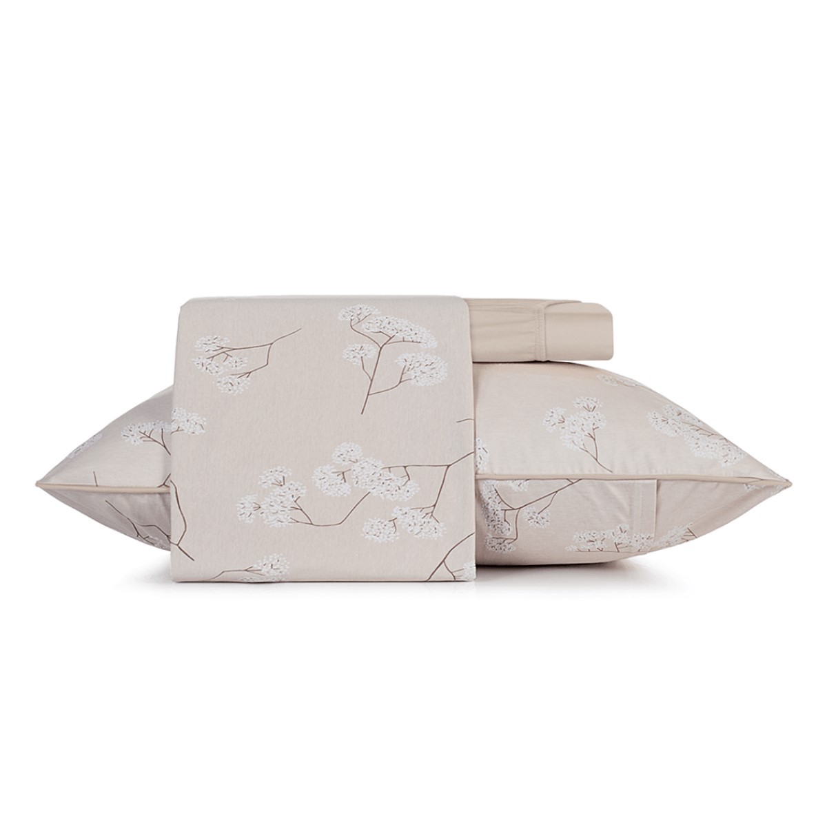 Apresentamos a elegante estampa Pampa, um convite à delicadeza e à sofisticação. Seu design traz o charme natural dos ramos florais em tom bege suave, criando um visual leve, acolhedor e repleto de harmonia. Confeccionado em tecido de malha fio penteado, o jogo oferece conforto e maciez, valorizando cada detalhe do seu descanso.