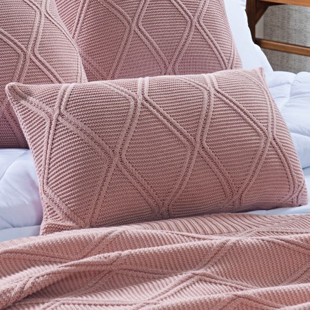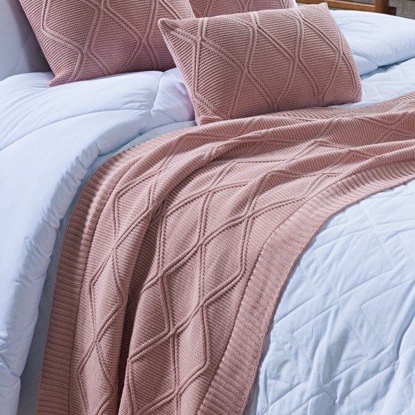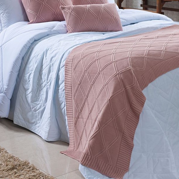 O kit peseira e duas almofadas 30x50cm apresenta um trançado geométrico em tom rosa que adiciona textura e elegância à decoração. Confeccionado em 100% poliéster. O conjunto valoriza a cama com um visual acolhedor e contemporâneo — perfeito para compor ambientes com charme, conforto e personalidade.