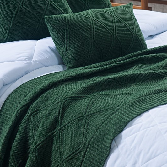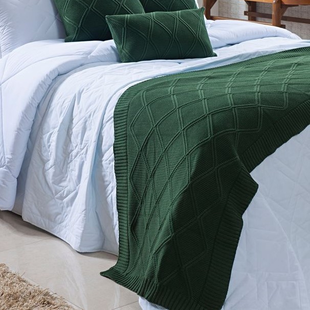 O kit peseira e duas almofadas 30x50cm apresenta um trançado geométrico em tom verde que adiciona textura e elegância à decoração. Confeccionado em 100% poliéster. O conjunto valoriza a cama com um visual acolhedor e contemporâneo — perfeito para compor ambientes com charme, conforto e personalidade.