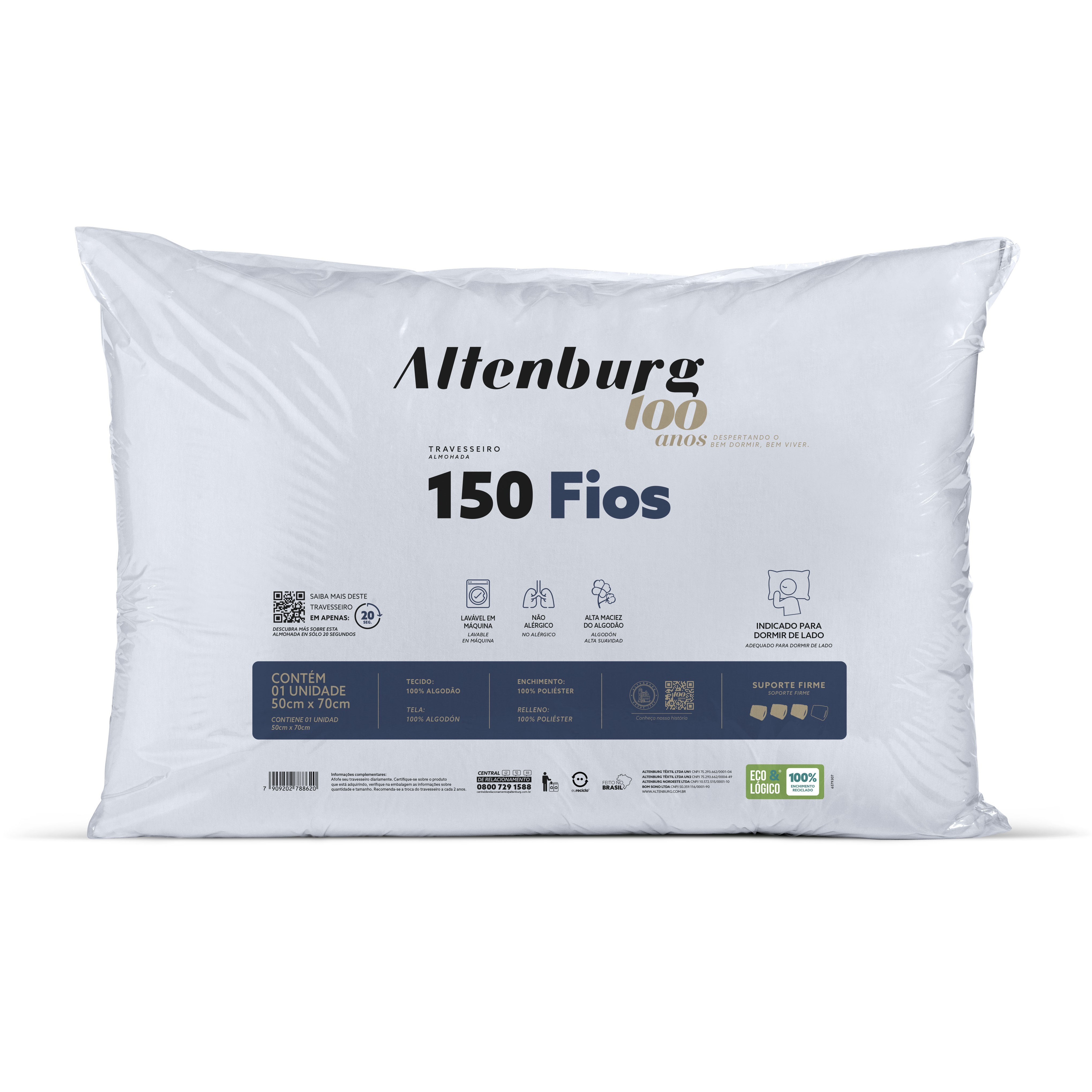 O Travesseiro ideal é um item imprescindível para que você tenha uma boa noite de sono e comece seu dia bem disposto. O modelo 150 fios da marca Altenburg é referência de qualidade. Ideal para quem dorme de lado, ele é confeccionado em tecido 100% algodão.