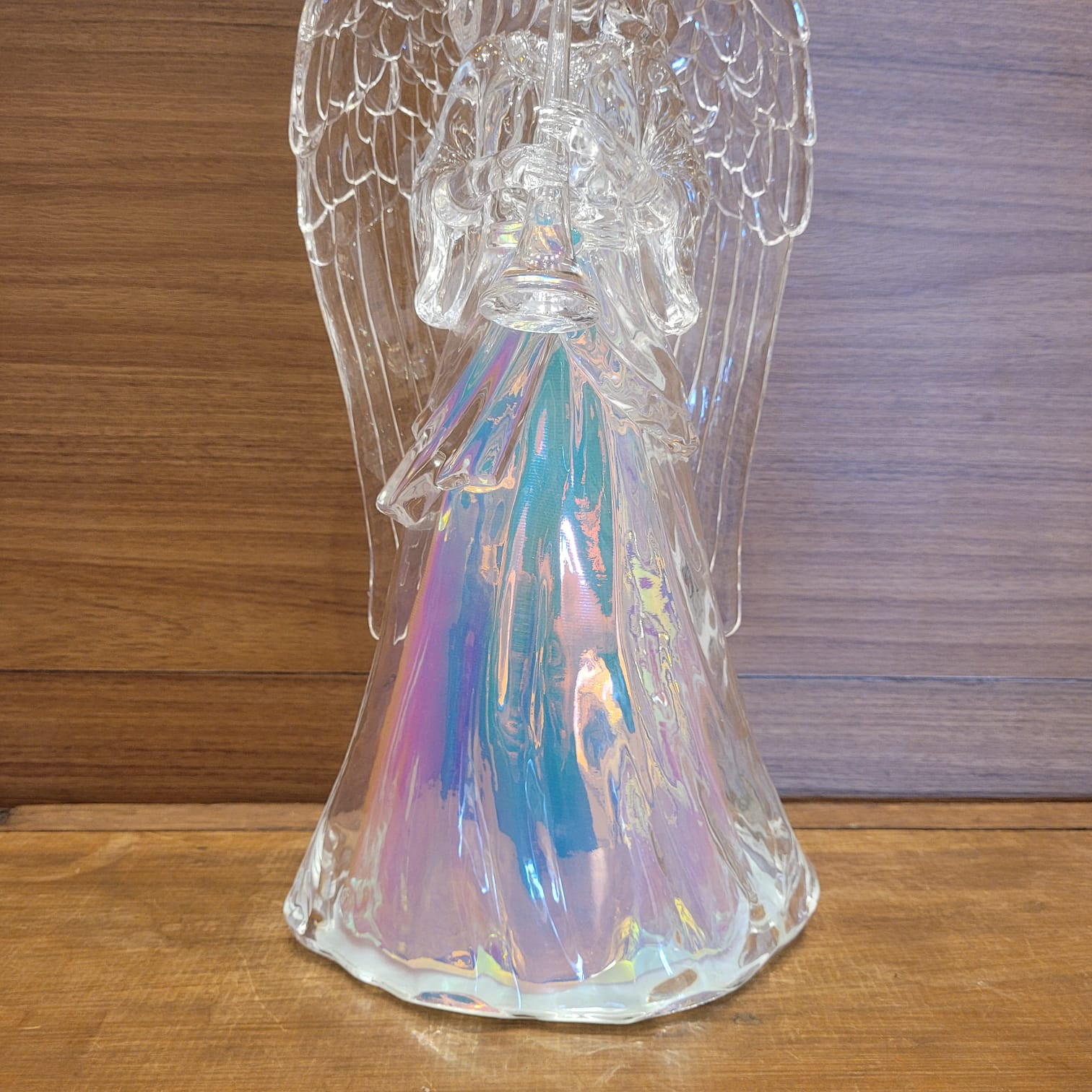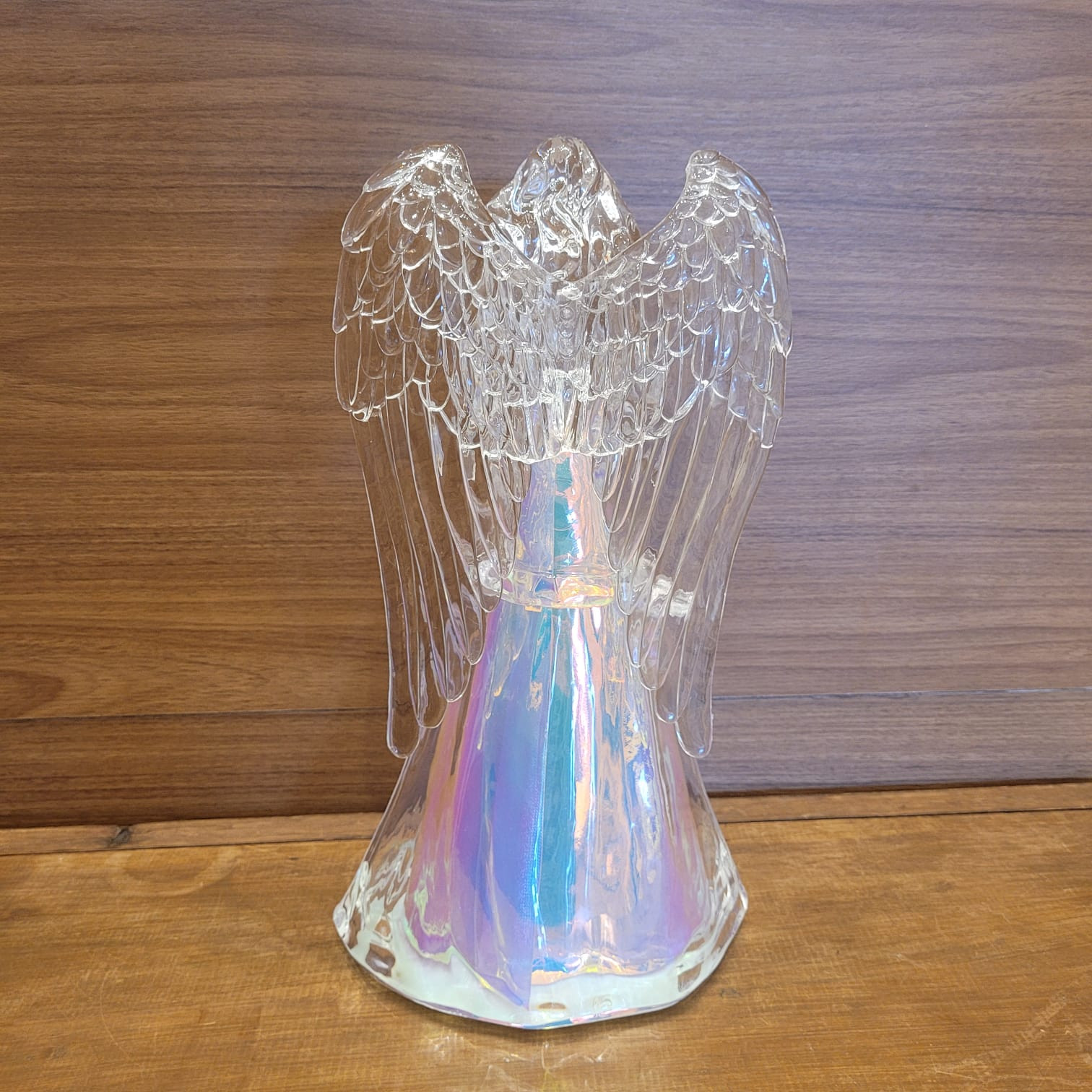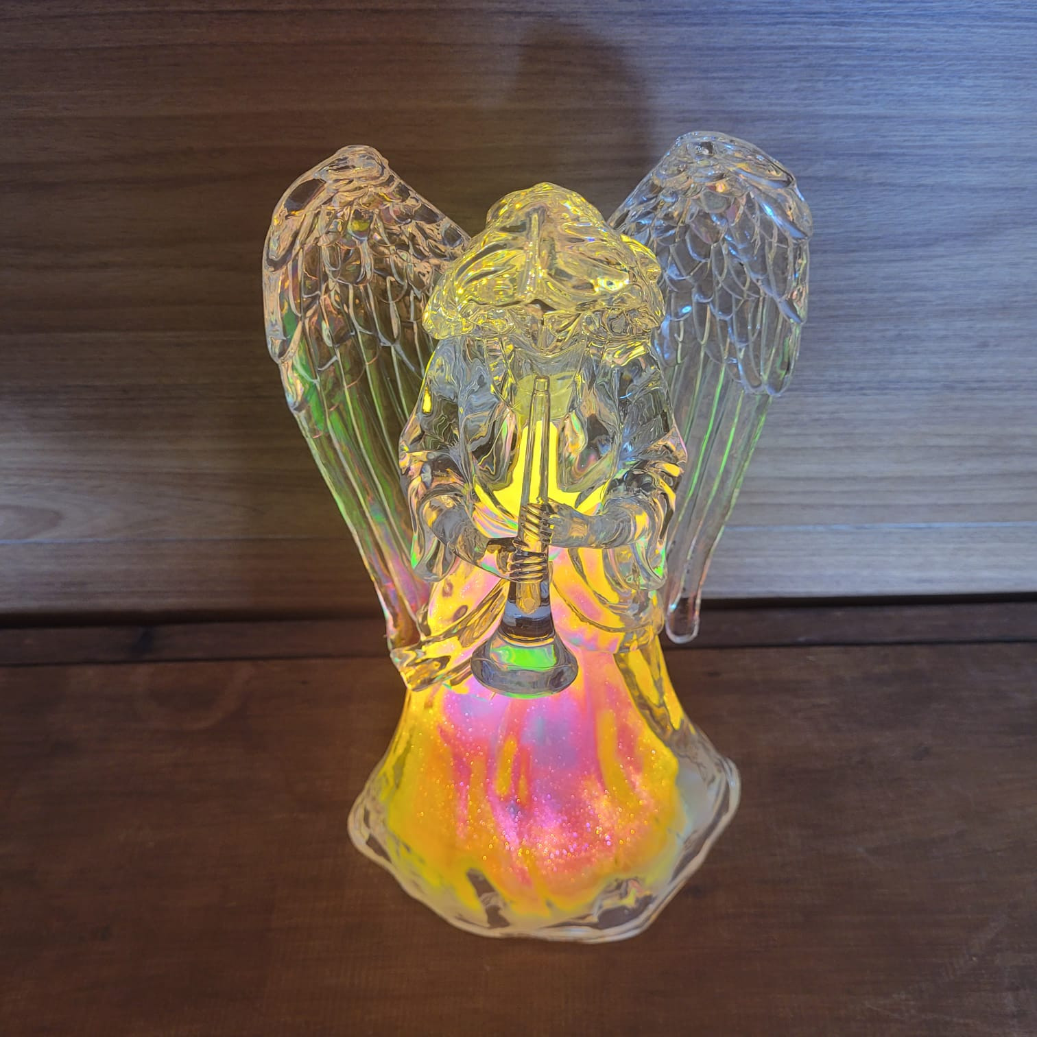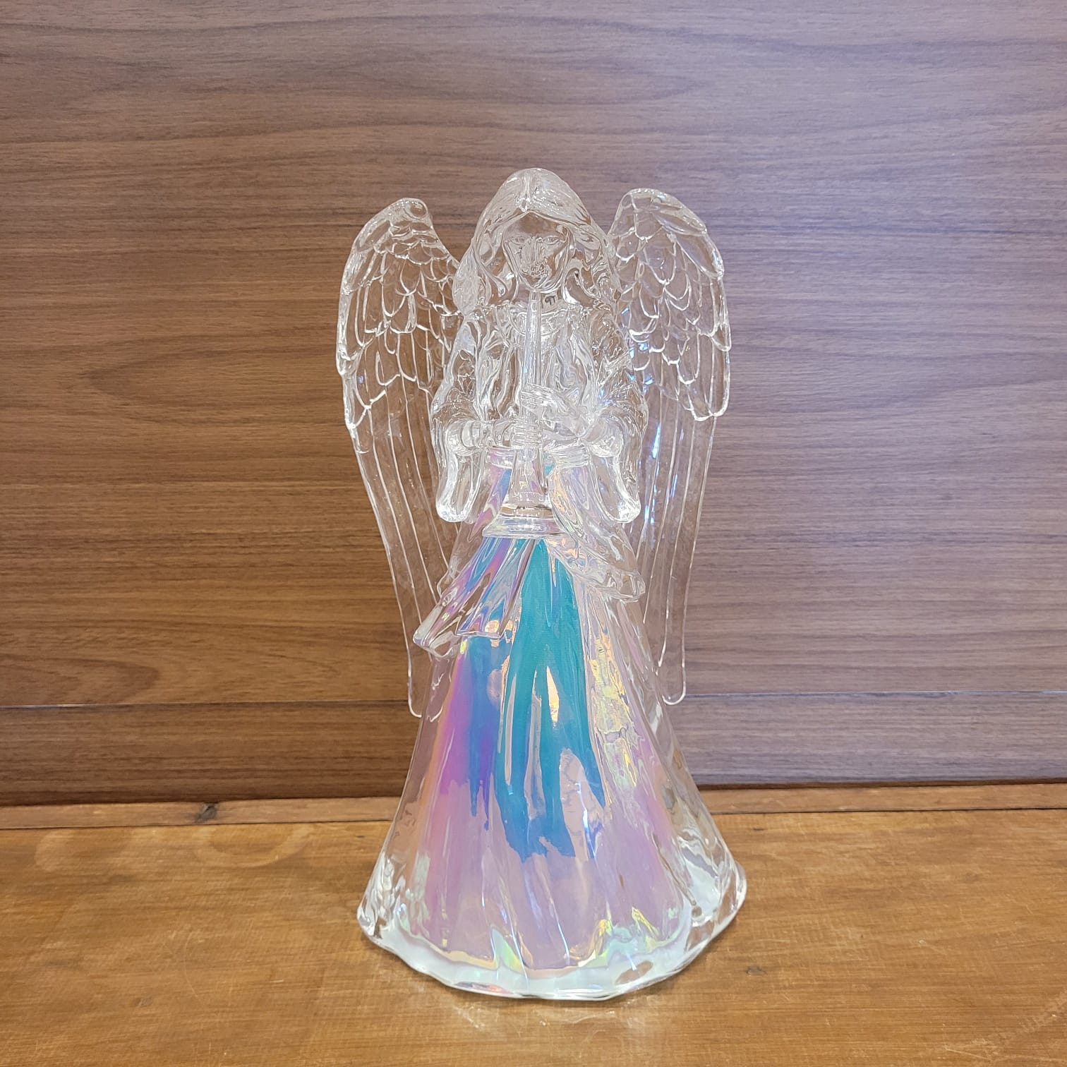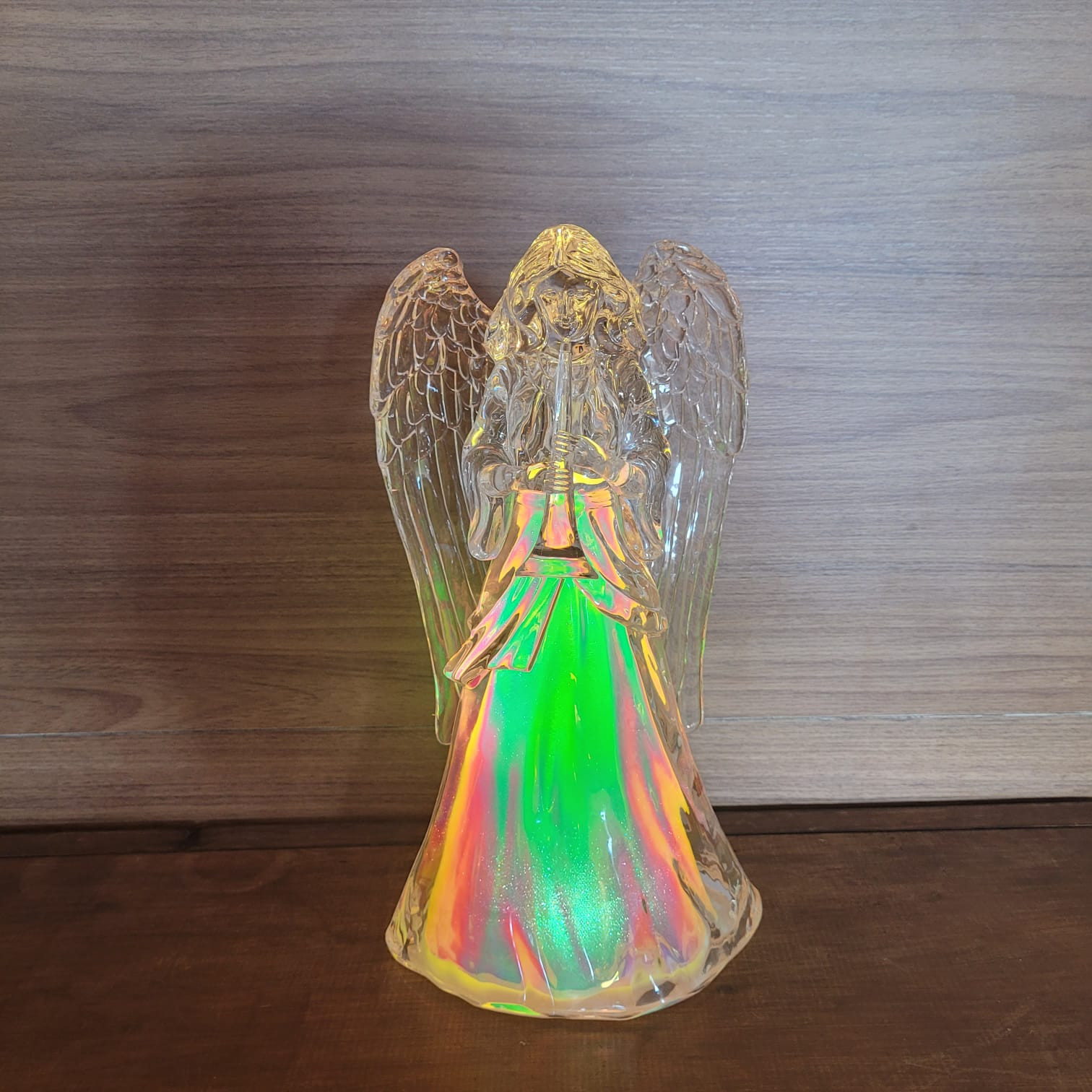 Funcionamento por LED; anjo que emite cores por meio de material translúcido.