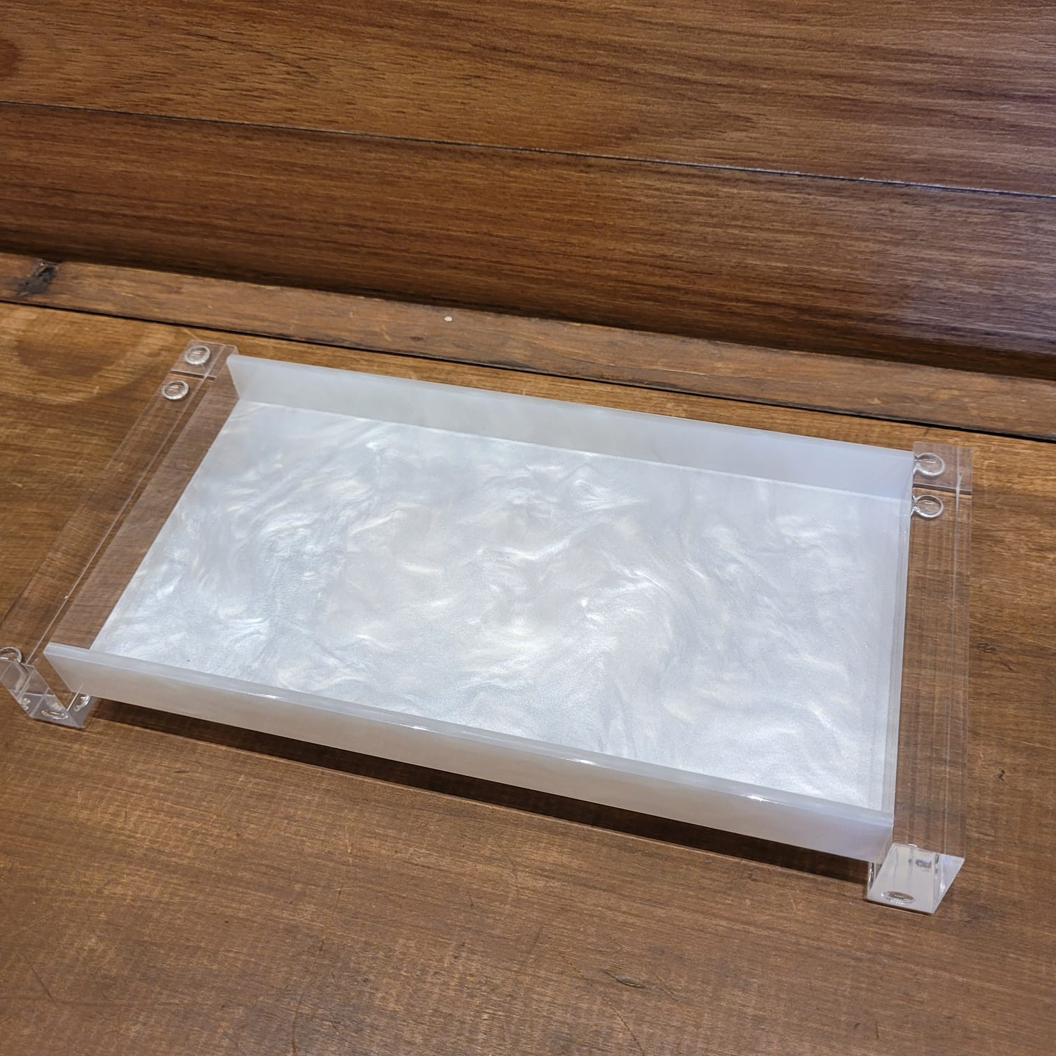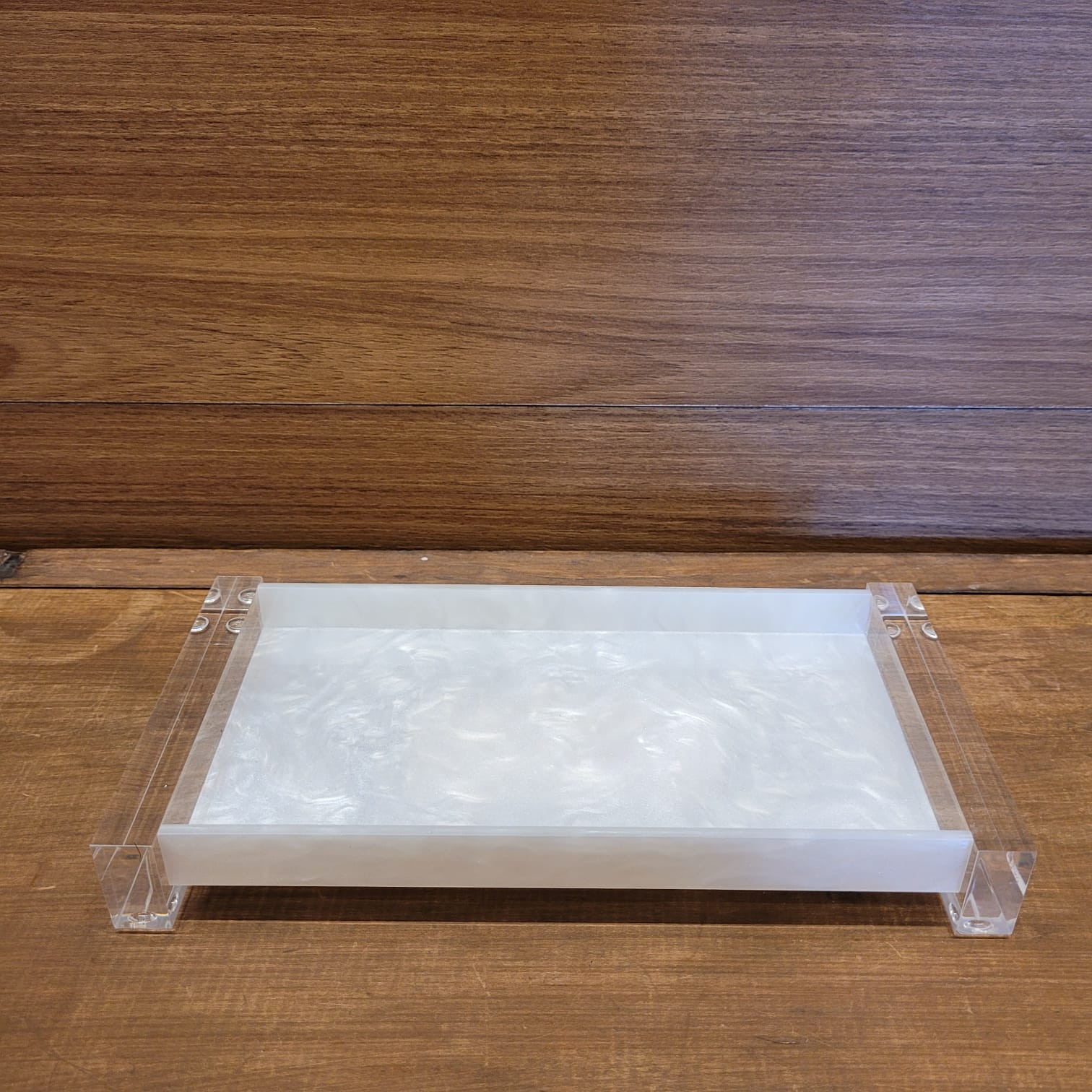 A bandeja pérola é produzida em acrílico transparente com base em material na cor pérola, resultando em um design moderno e atemporal.