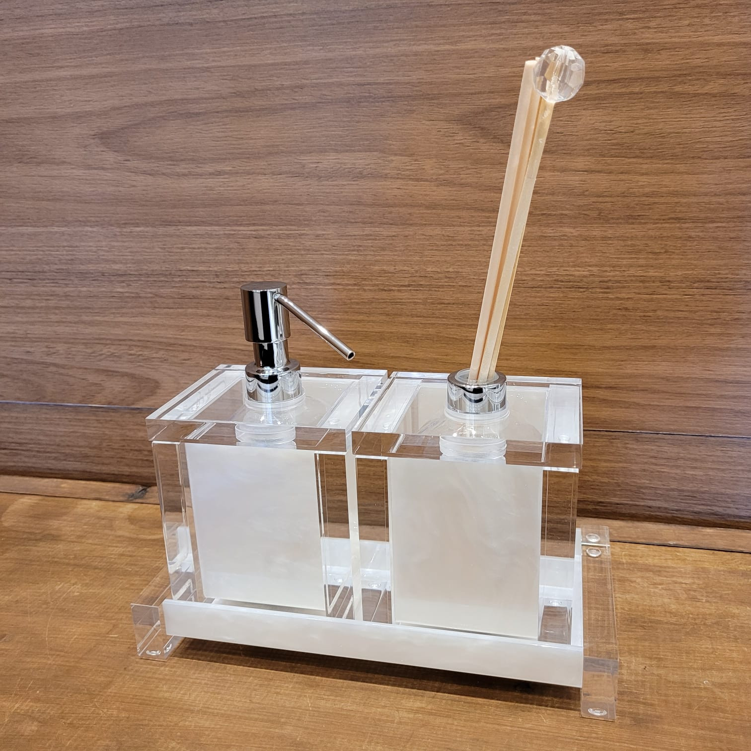 Material: Acrílico transparente com base em material na cor pérola
