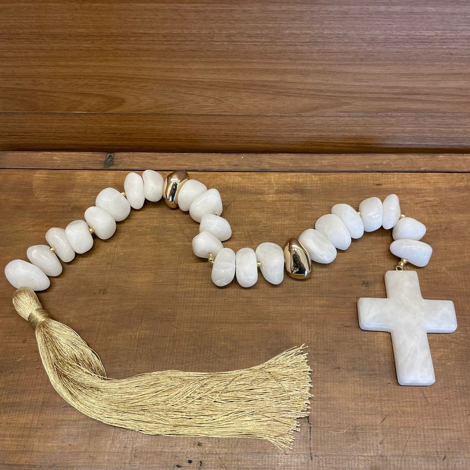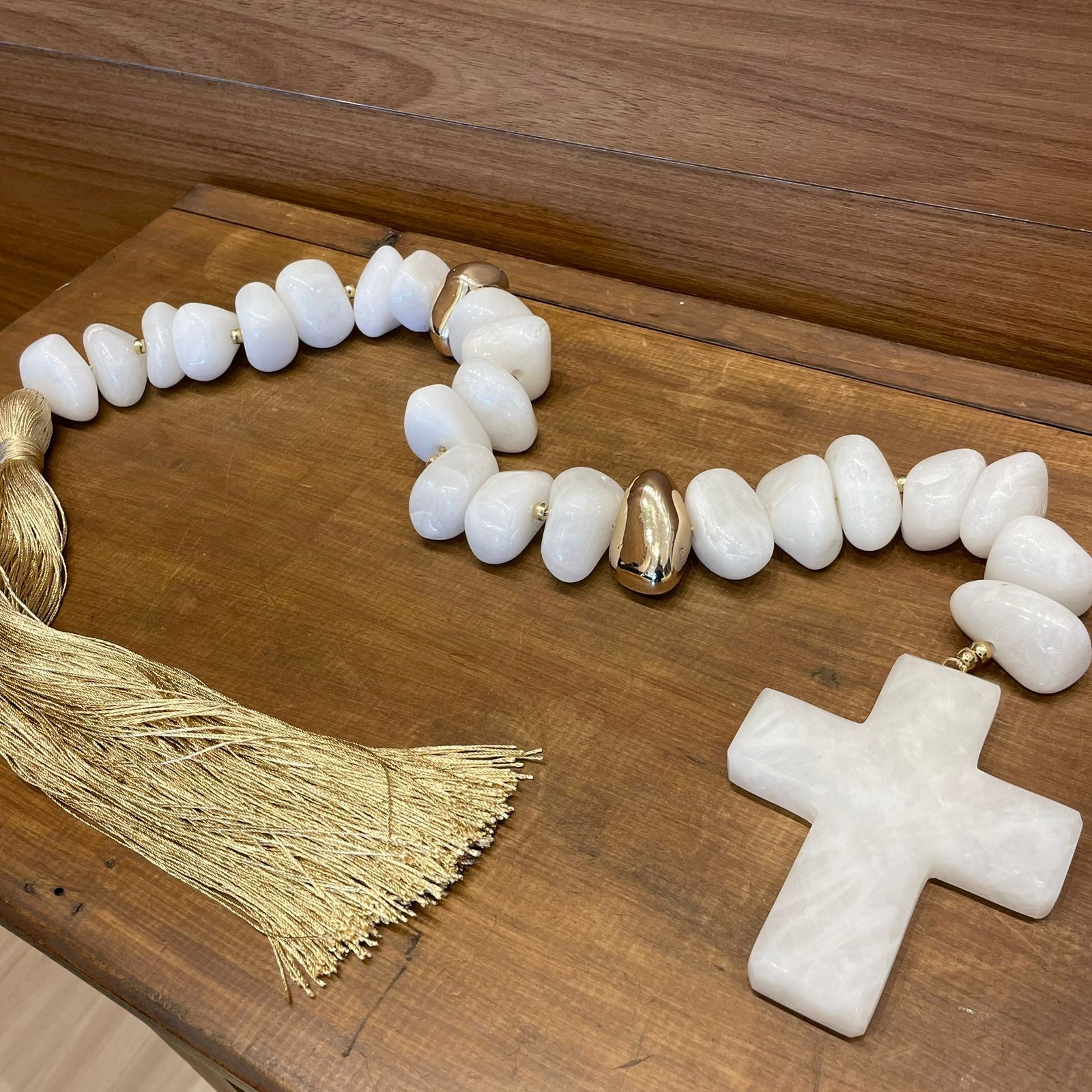 Perfeito para compor mesas de centro, aparadores, racks ou bandejas decorativas, pode ser disposto de forma solta, em curvas ou levemente apoiado sobre livros e objetos, criando composições visuais leves e contemporâneas. A cruz em pedra, simbolizando fé e amor, traz um toque especial e acolhedor à peça, enquanto o tassel em tom dourado acrescenta movimento e um acabamento sofisticado ao conjunto.
