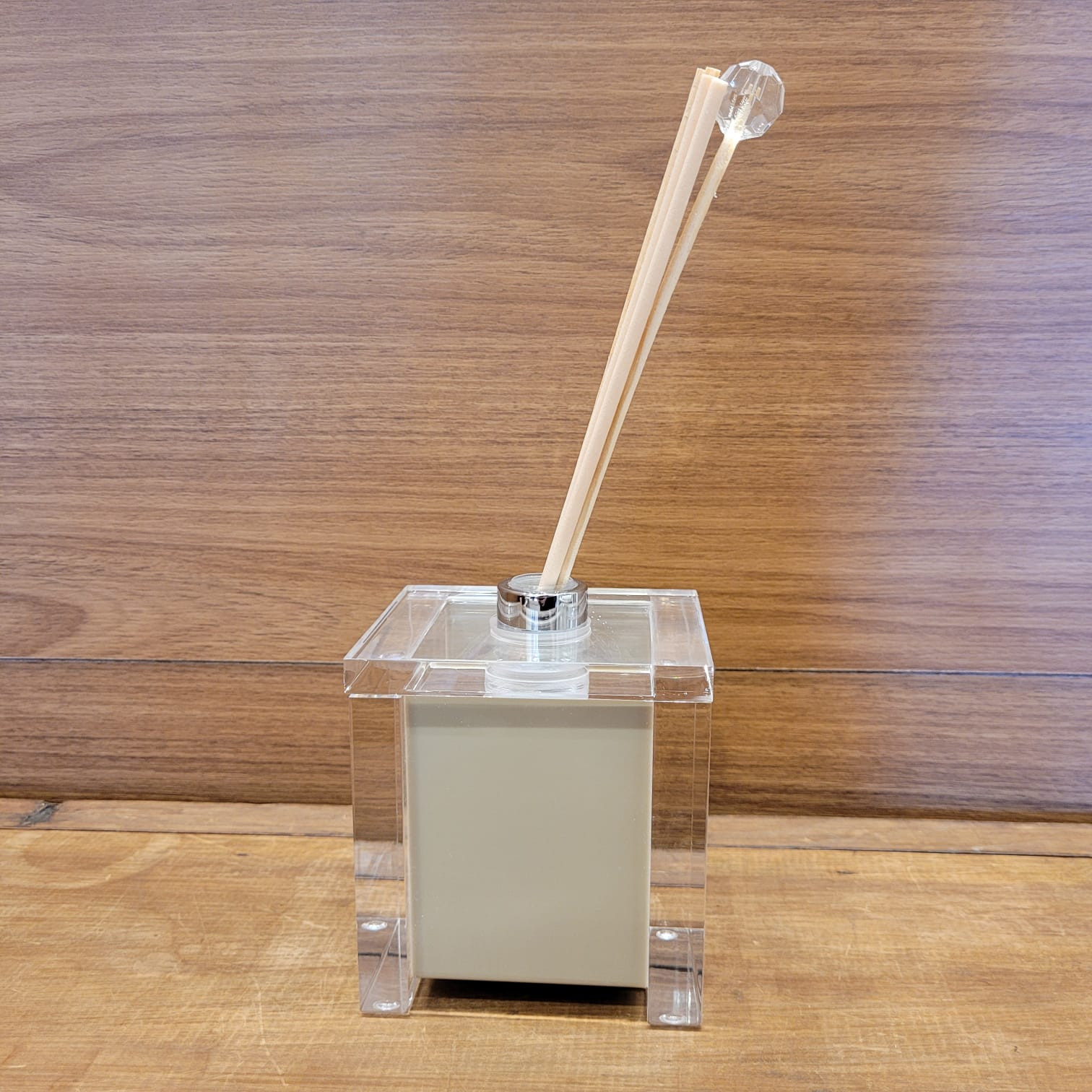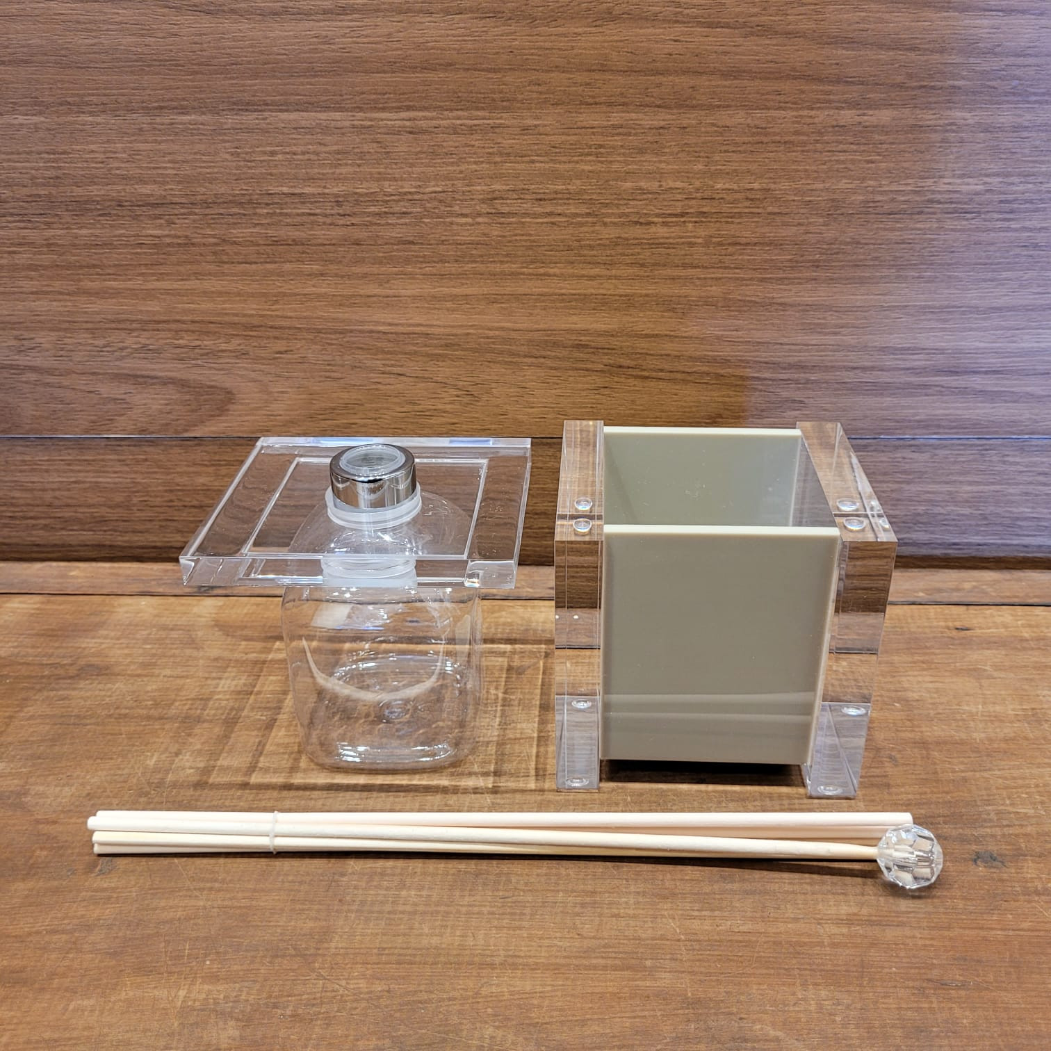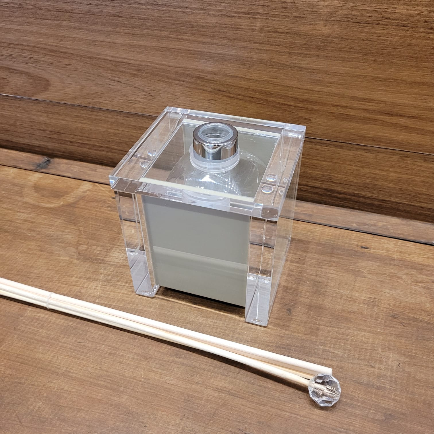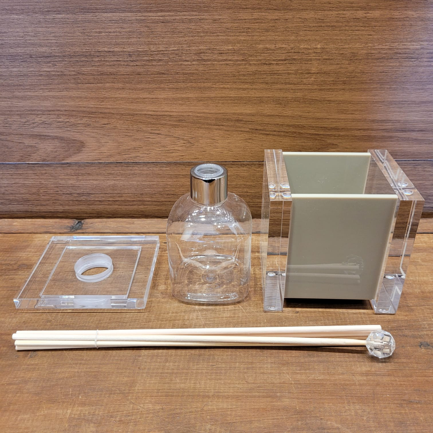O difusor champanhe é produzido em acrílico transparente, com frasco interno em plástico e tampa metálica cromada.