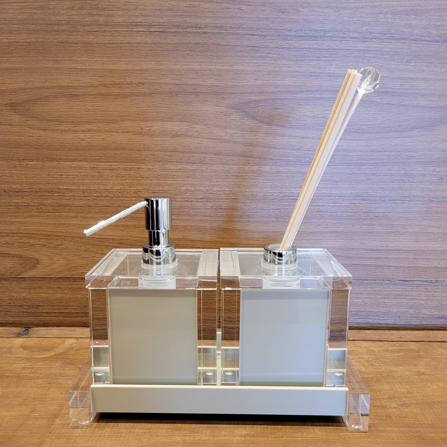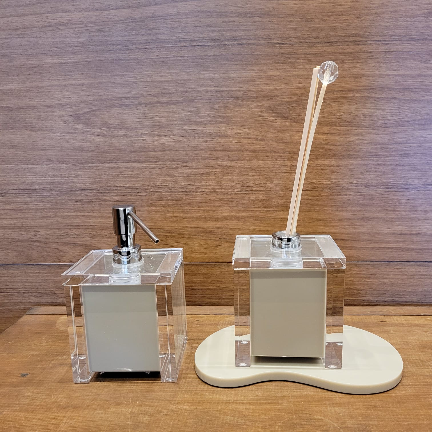Material: Acrílico transparente com frasco interno em plástico e tampa metálica cromada