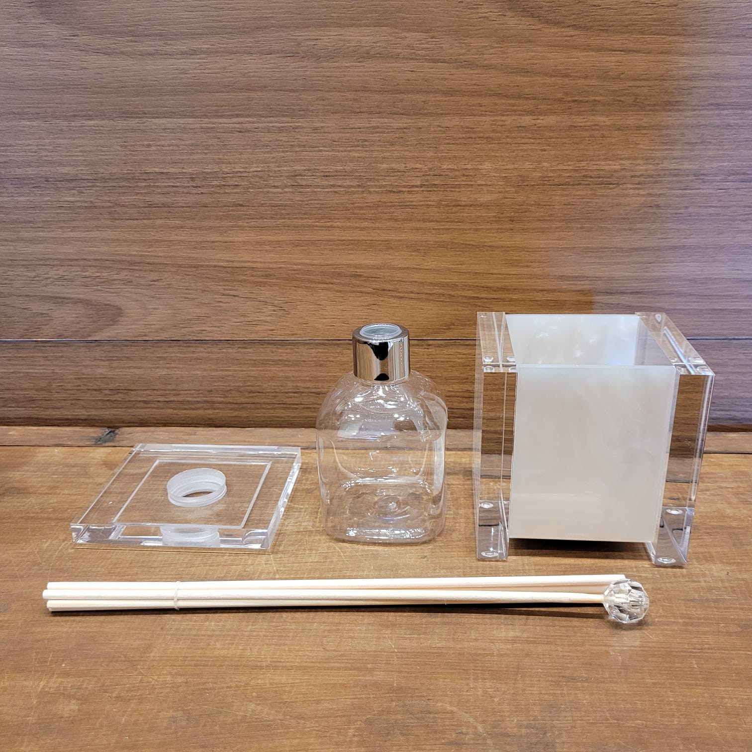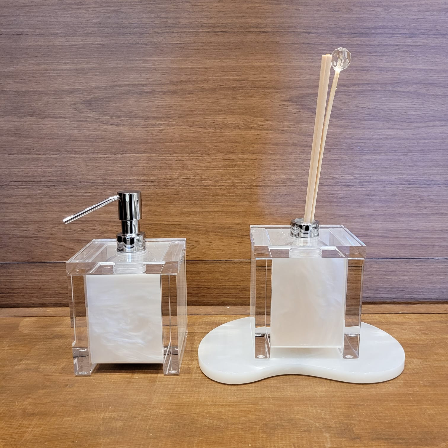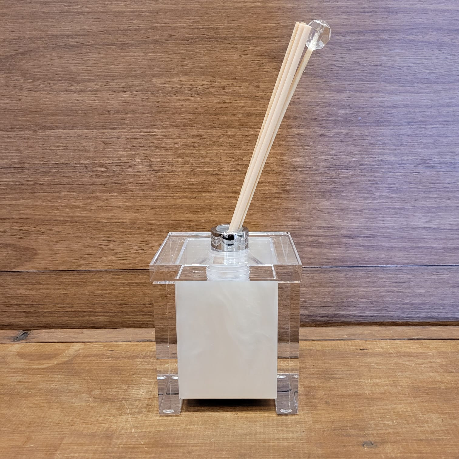 O difusor pérola é produzido em acrílico transparente, com frasco interno em plástico e tampa metálica cromada.