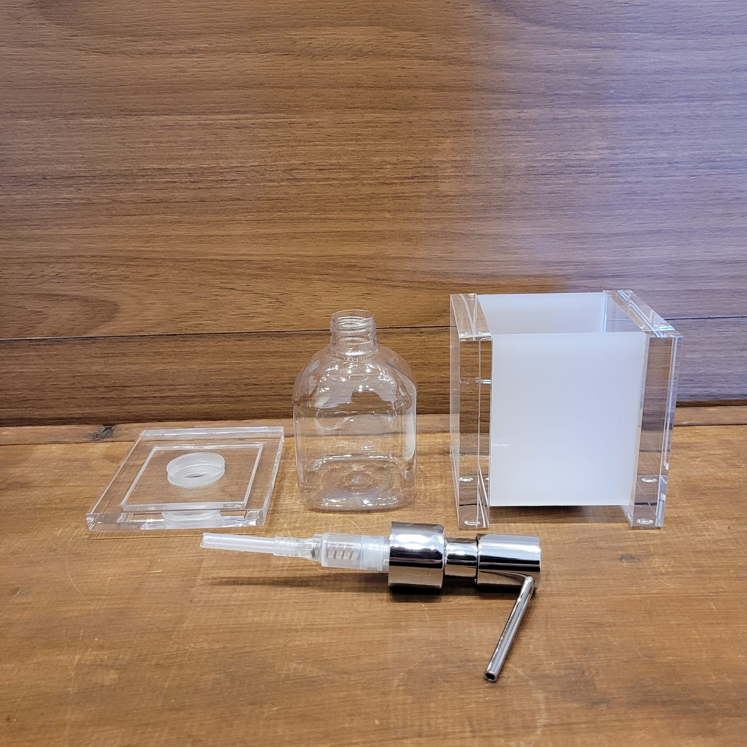 Material: Acrílico transparente com frasco interno em plástico e válvula em metal cromado