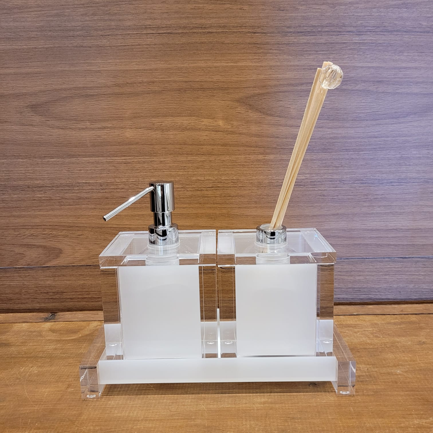 Com design sofisticado e funcional, a saboneteira jateado é produzida em acrílico transparente, com dispenser em metal cromado.