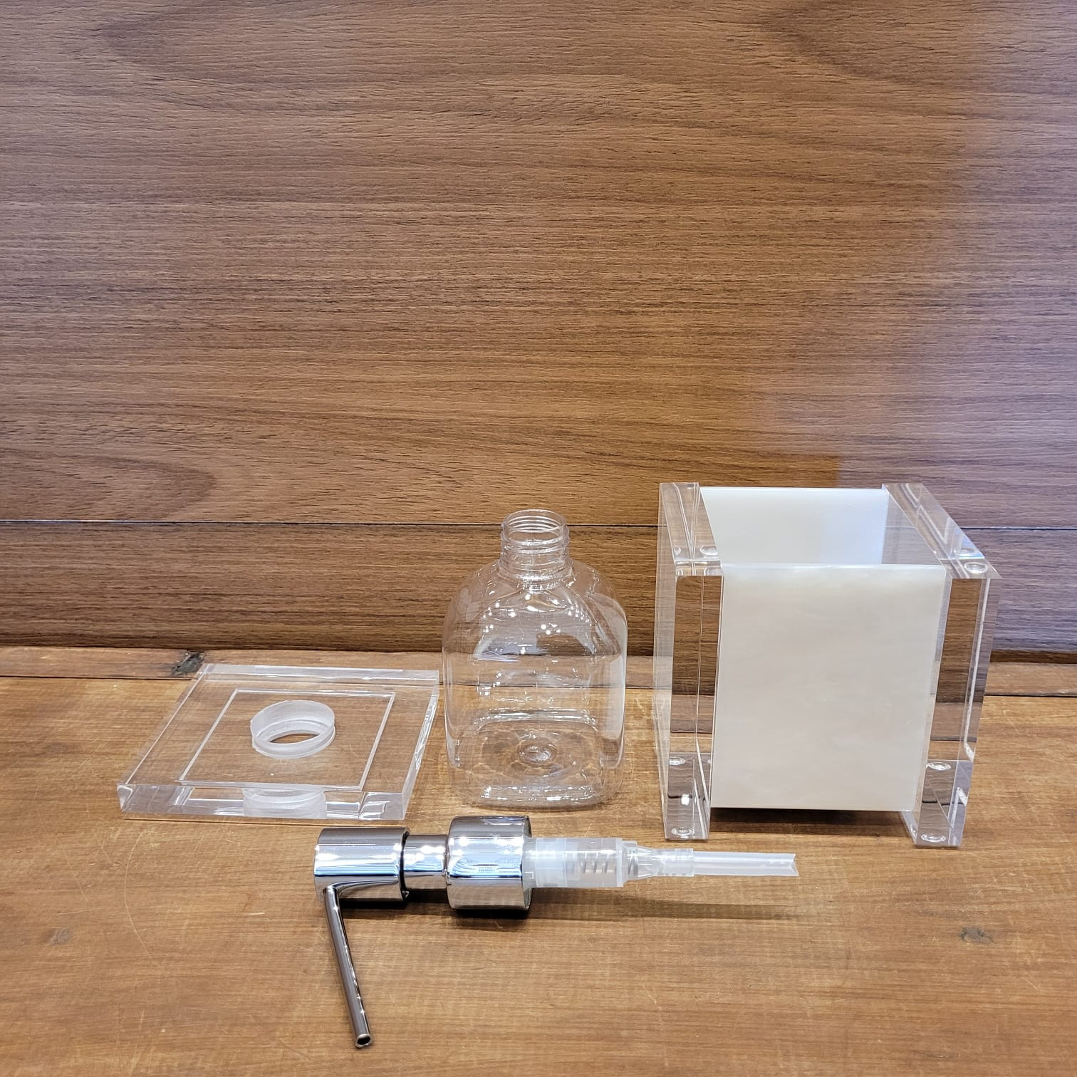 Material: Acrílico transparente com frasco interno em plástico e válvula em metal cromado