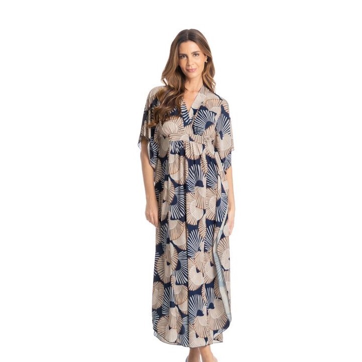 Kaftan longo Oceano é pura elegância! Em modelagem ampla, confortável e em comprimento longo, com decote em V transpassado. Possui faixa na cintura franzida, produzindo um lindo e fluído efeito na peça, além de valorizar o corpo. Suas mangas são alongadas e amplas. Detalhe para fenda lateral. A peça conta com uma sofisticada estampa. Muito conforto para suas horas de descanso!