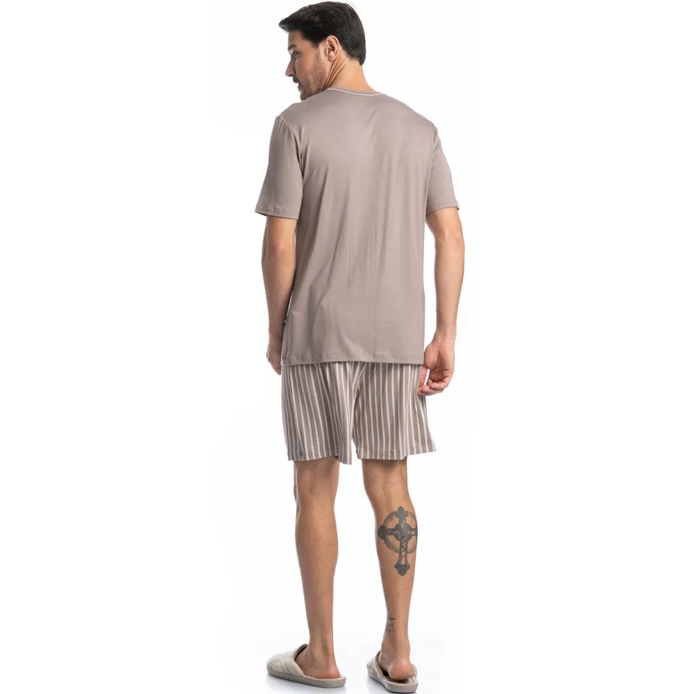 Pijama masculino Mateo Tombini é excelente para os dias mais quentes! A blusa possui uma modelagem confortável, manga curta com decote “V” e trançador de tom contrastante. Detalhe para o bordado logo Tombini na lateral esquerda. Seu short é todo estampado em uma moderna e exclusiva listra. Muito estilo e conforto para estar com você nos melhores momentos!
