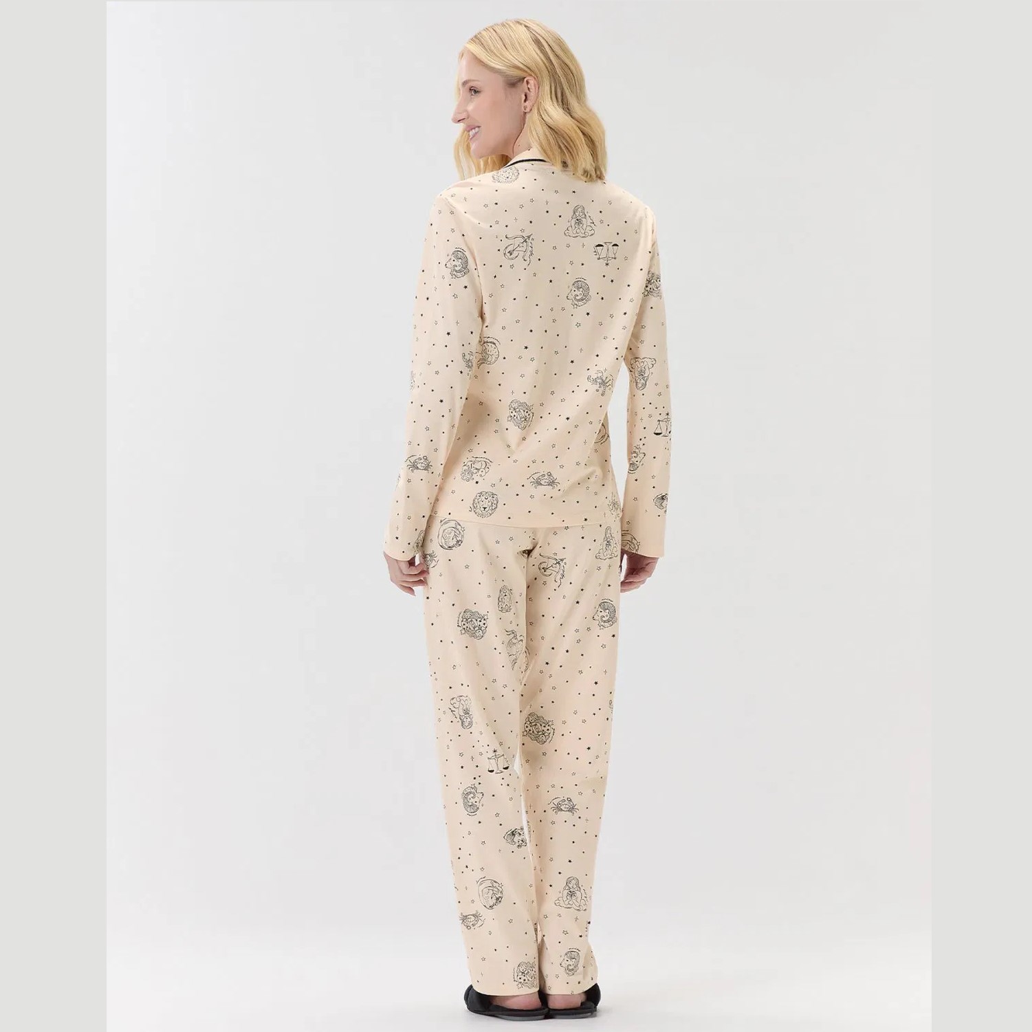 A blusa de manga longa possui fundo bege com estampa rotativa dos signos do zodíaco, transmitindo charme e personalidade. O destaque fica por conta do detalhe em filete de fita pompom na vista e na gola, que adiciona delicadeza e sofisticação à peça.