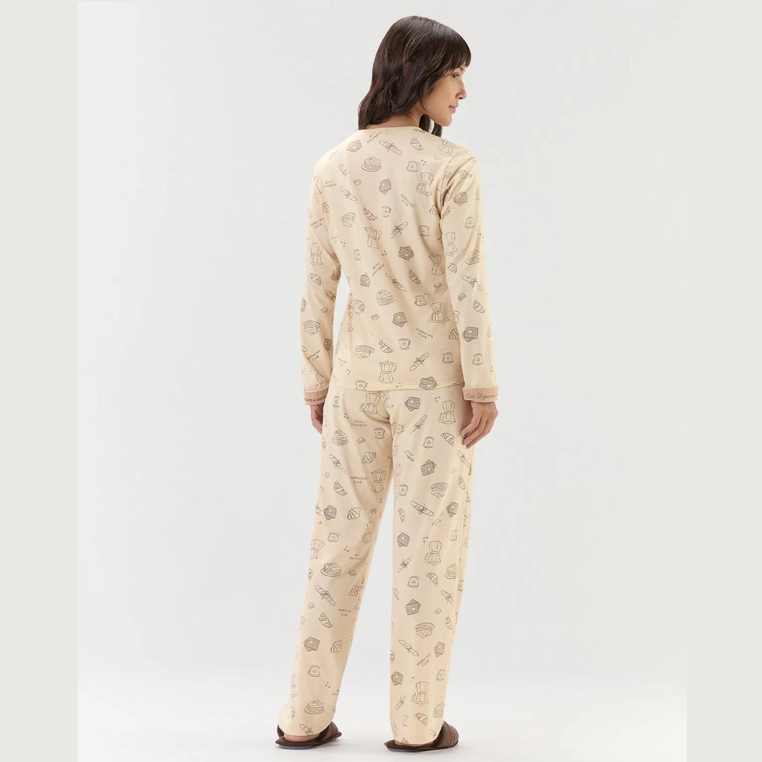 Pijama de manga longa com calça, confeccionado em malha comfort de toque macio e leve, proporcionando conforto e bem-estar durante o uso. O conjunto possui fundo bege com estampa rotativa de ícones inspirados no café da manhã, como cafeteira italiana, baguetes, panquecas, croissants, waffles e xícaras de chá, que conferem um ar delicado e descontraído à peça.