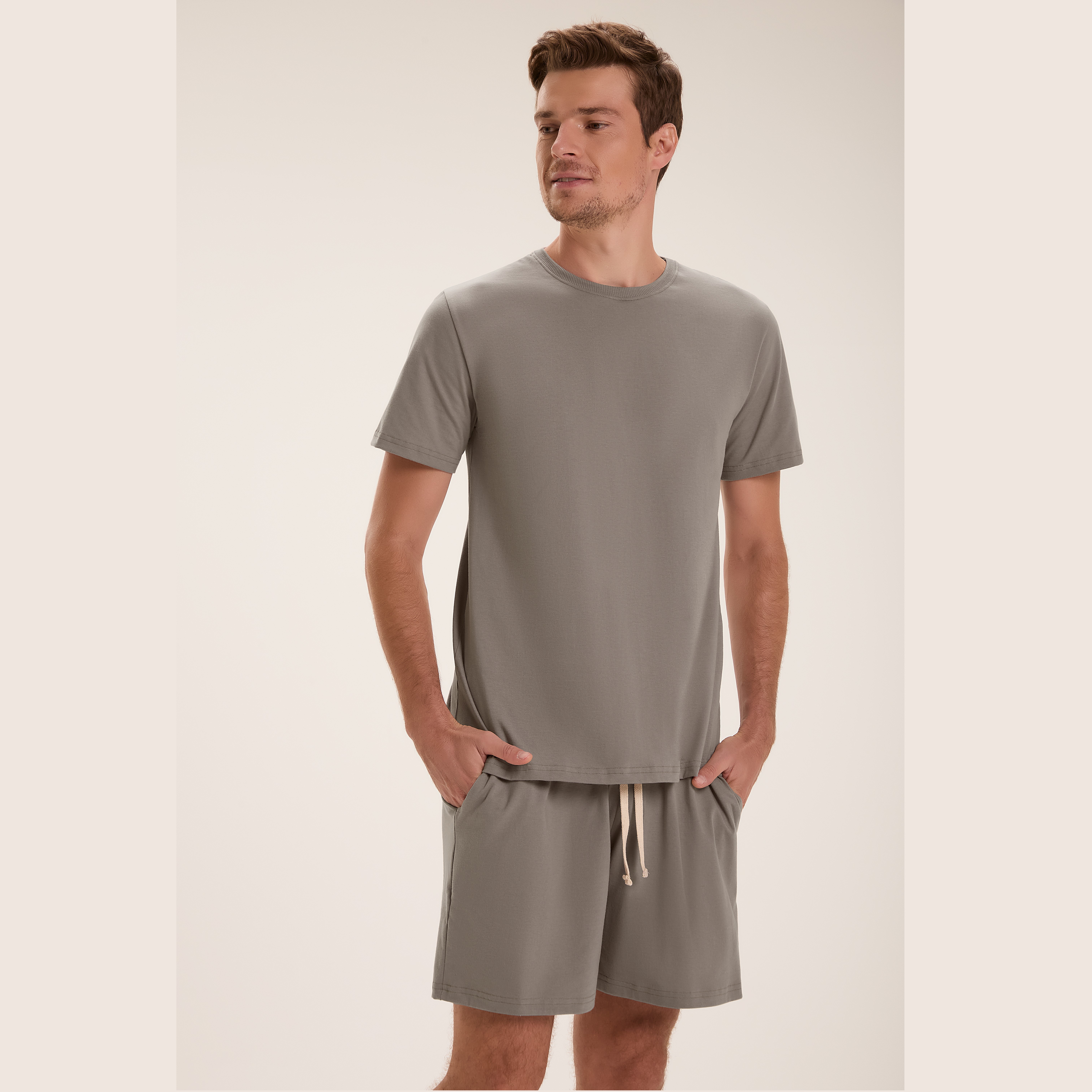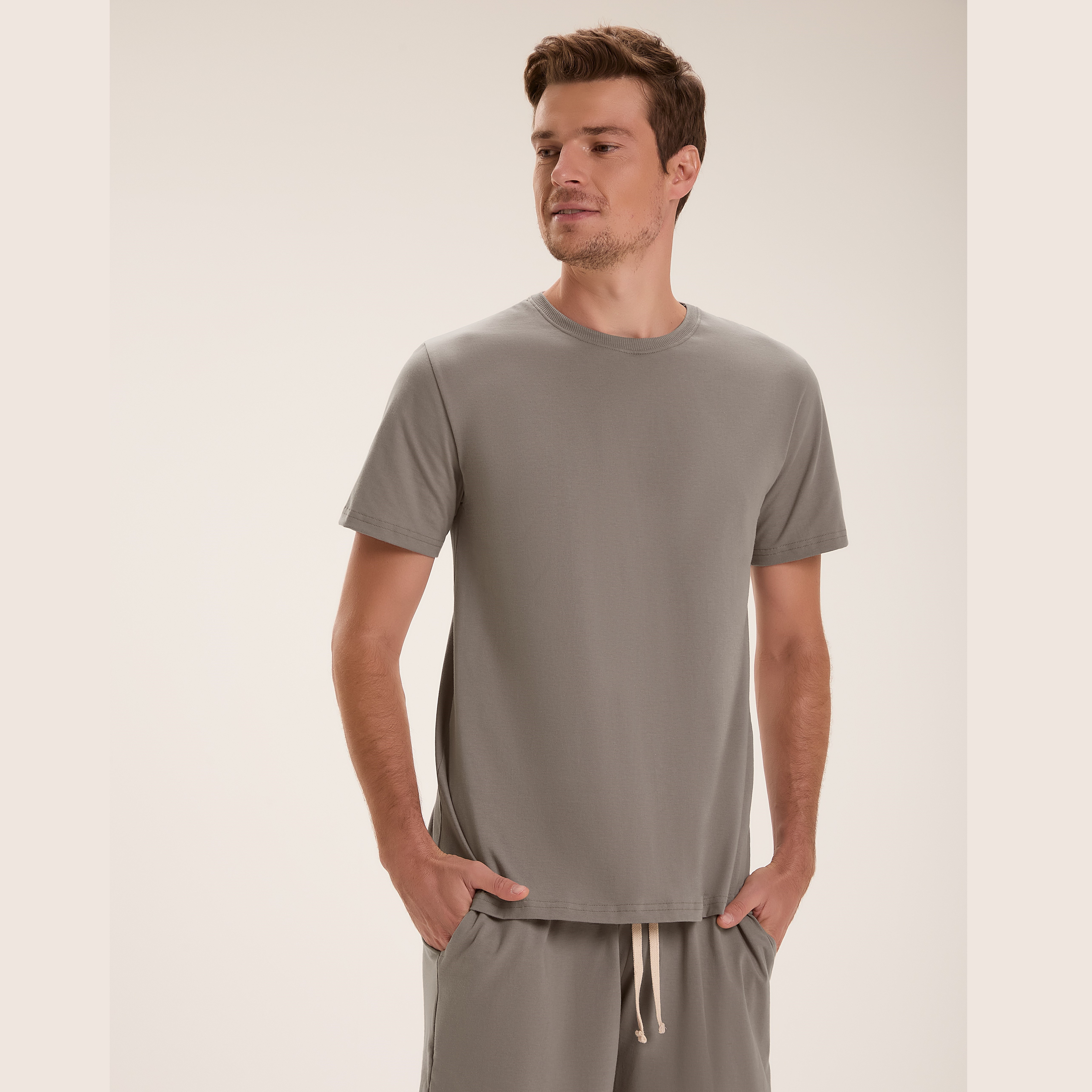 Perfeito para quem valoriza conforto e estilo na hora de relaxar, este pijama masculino em malha comfort traz um visual moderno e minimalista. A blusa tem modelagem tradicional e fundo marrom claro liso, com toque macio e leve que proporciona bem-estar durante todo o uso.